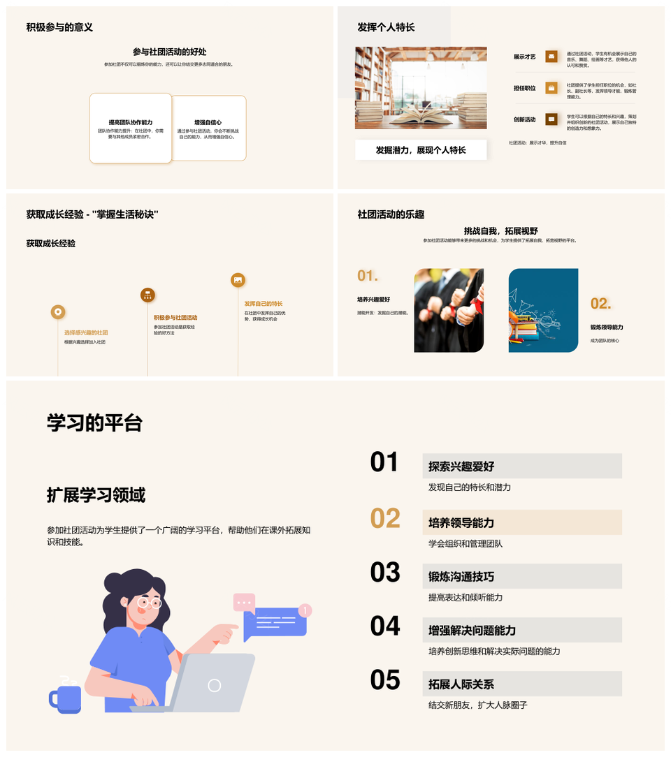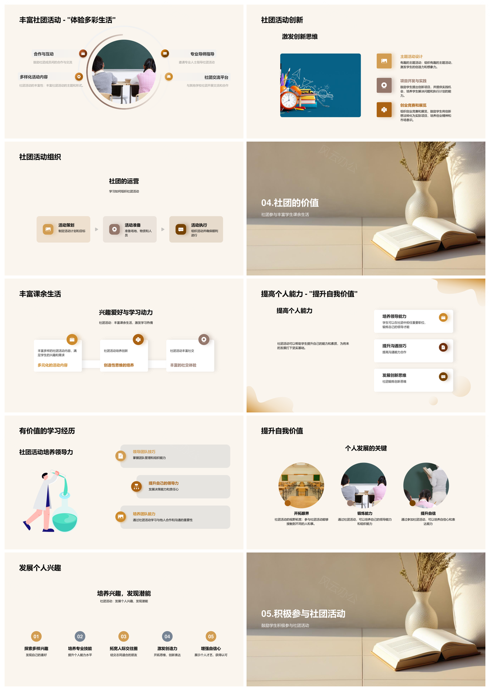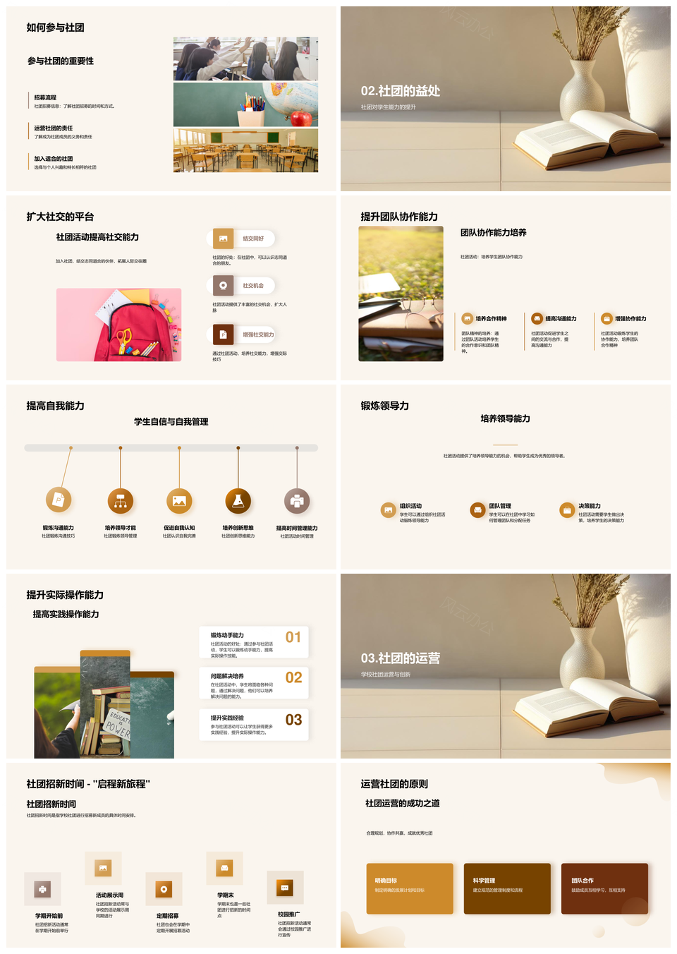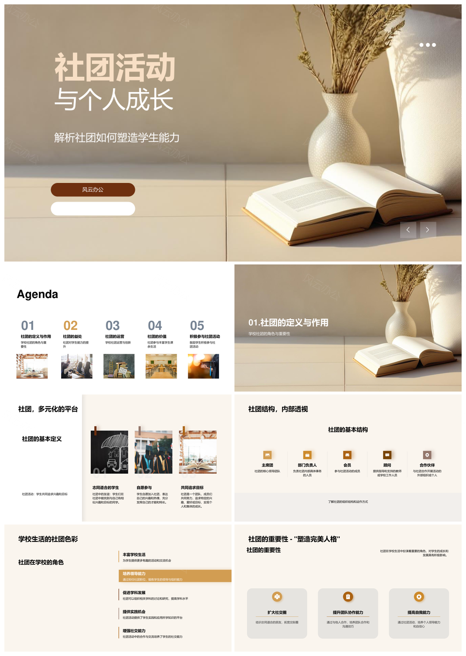 风云办公提供的社团活动提升学生协作与自我能力PPT模板,下载格式为pptx,一共33页,作品中文字及图均可以修改和编辑,图片更改请在作品中右键图片并更换,文字修改请直接点击文字进行修改。