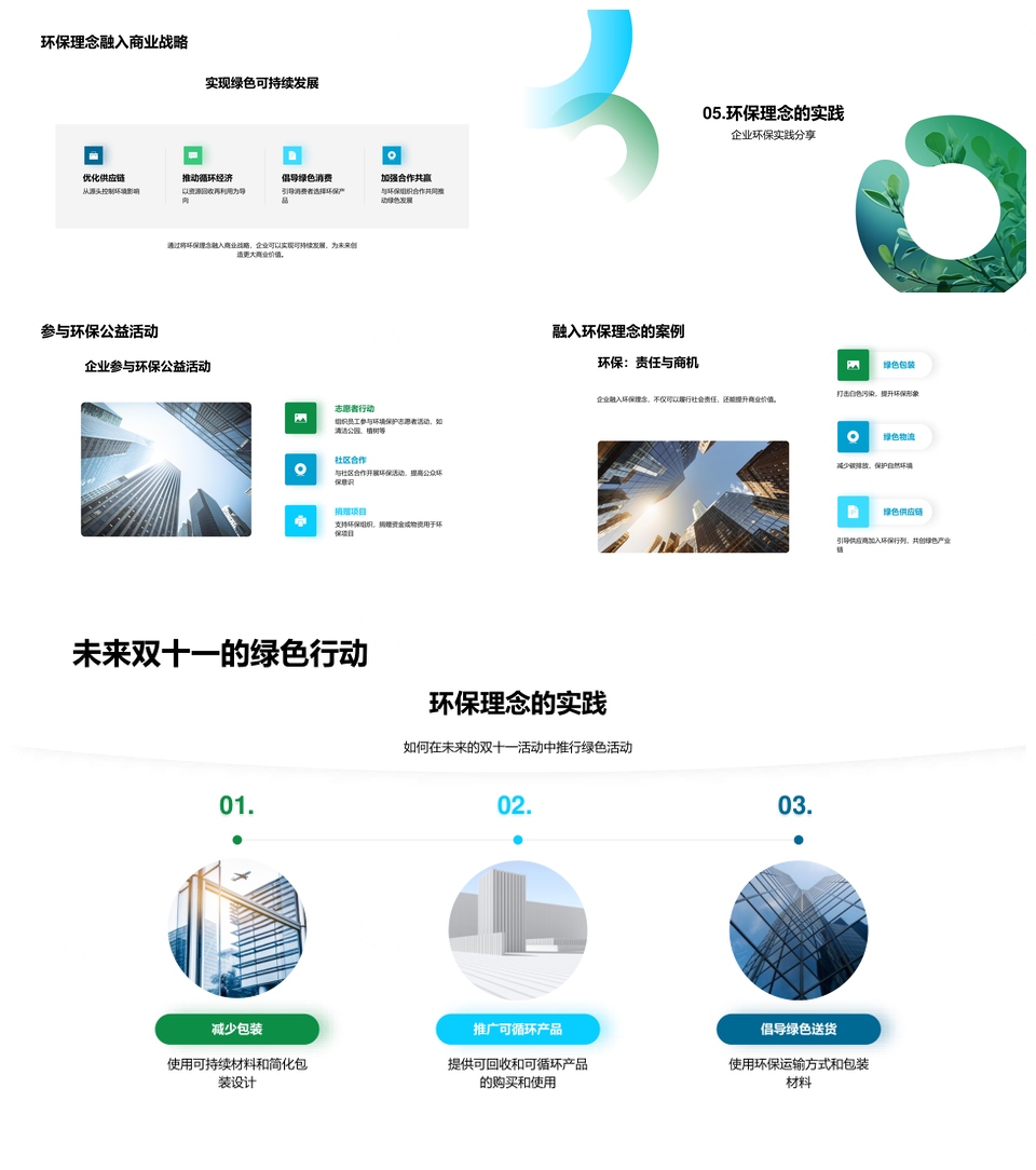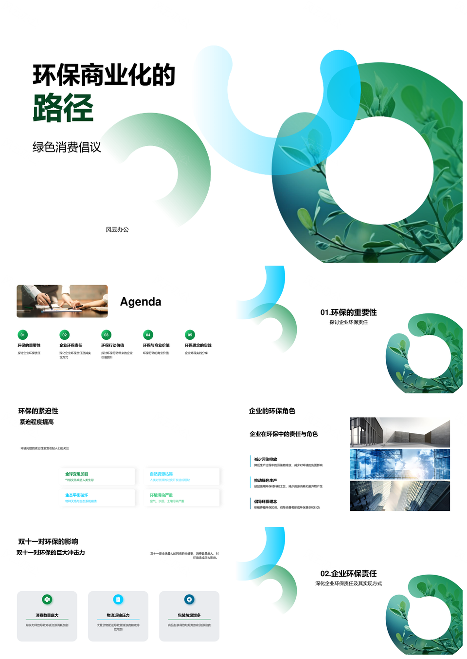 这是一张绿色消费双十一环保商业化企业责任产品行动绿叶形象PPT模板,包含绿色消费、双十一、环保、商业化、企业责任、产品行动、绿叶形象等主题内容,也可用作绿色消费双十一环保商业化、绿色消费双十一环保、双十一环保商业化企业责任、环保商业化企业责任产品、商业化企业责任产品行动、企业责任产品行动绿叶、产品行动绿叶形象、绿色消费双十一环保行动、环保企业责任产品形象、双十一企业责任绿叶形象、绿色消费环保商业化、环保企业责任绿叶、企业责任产品绿叶、双十一环保绿叶、行动绿叶形象等PPT场景使用。 风云办公提供的绿色消费双十一环保商业化企业责任产品行动绿叶形象PPT模板,下载格式为pptx,一共23页,作品中文字及图均可以修改和编辑,图片更改请在作品中右键图片并更换,文字修改请直接点击文字进行修改。