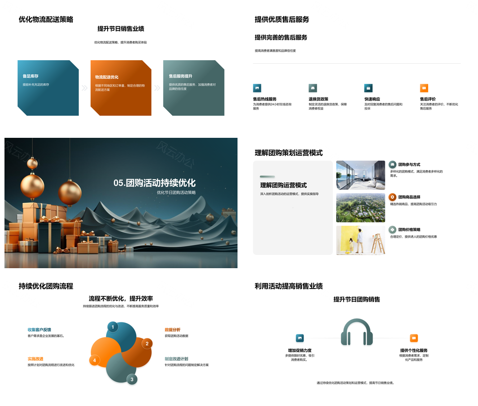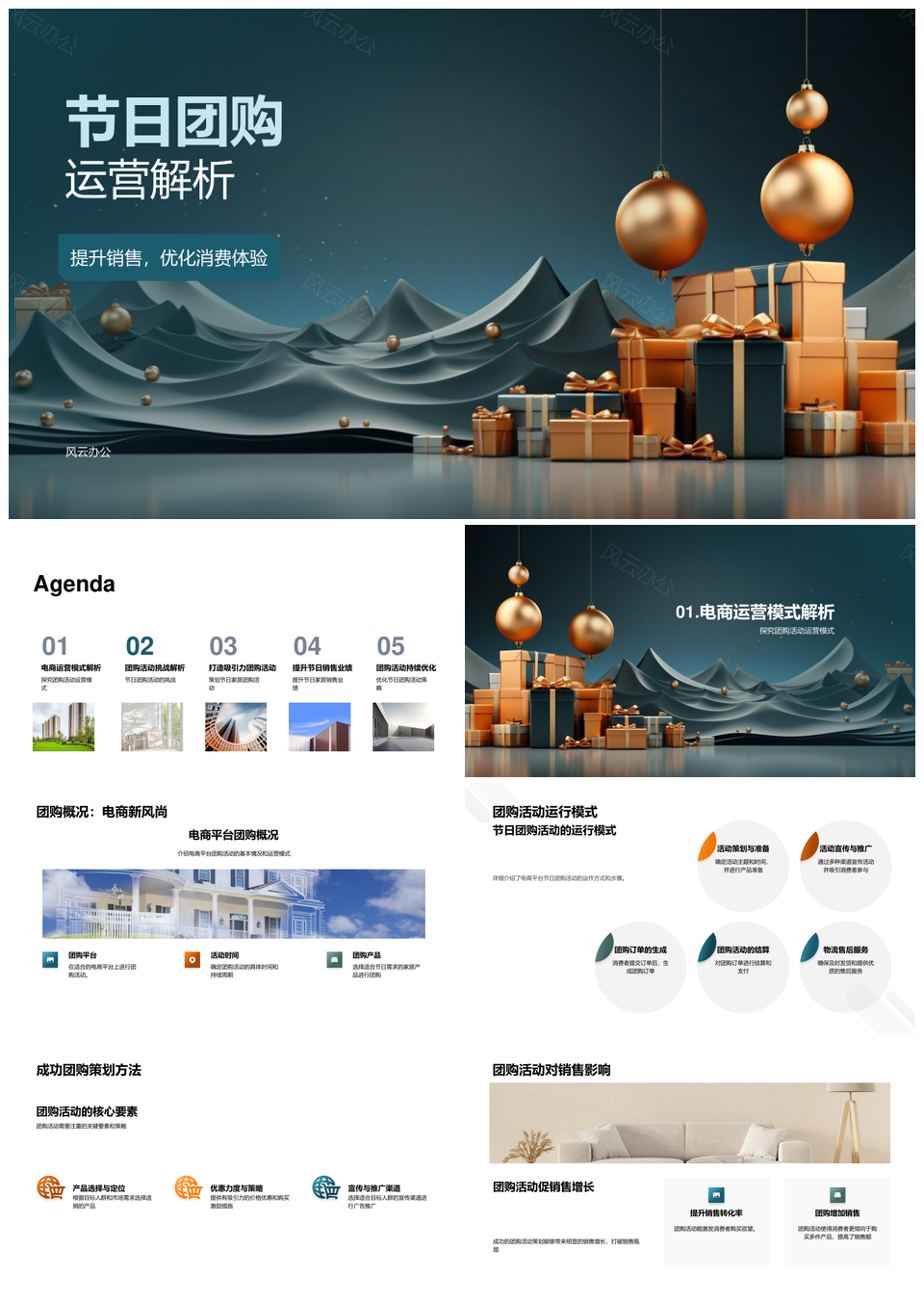 风云办公提供的电商节日团购活动策划运营解析PPT模板,下载格式为pptx,一共24页,作品中文字及图均可以修改和编辑,图片更改请在作品中右键图片并更换,文字修改请直接点击文字进行修改。