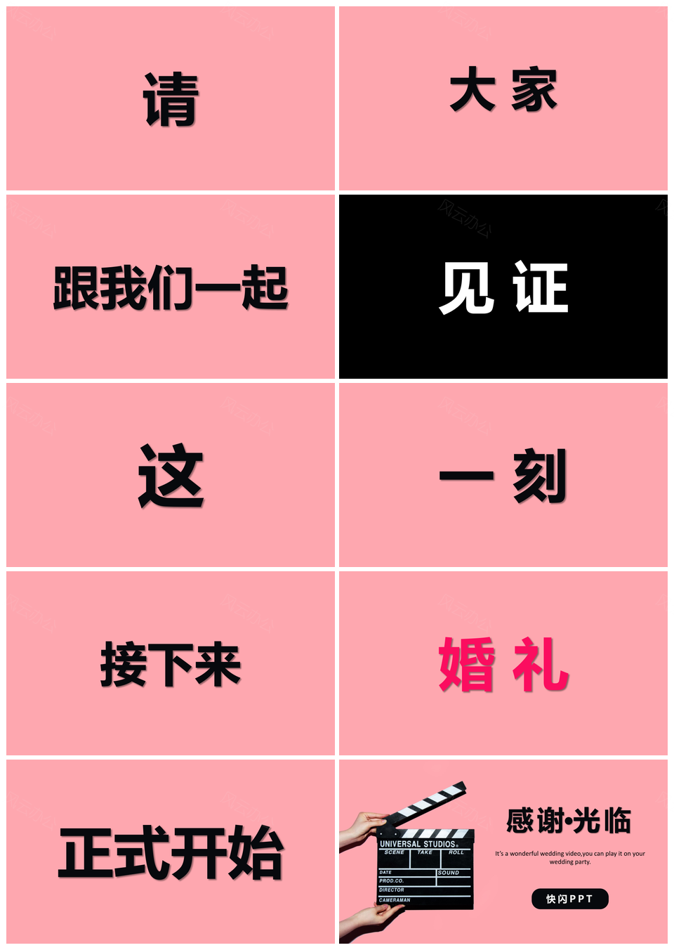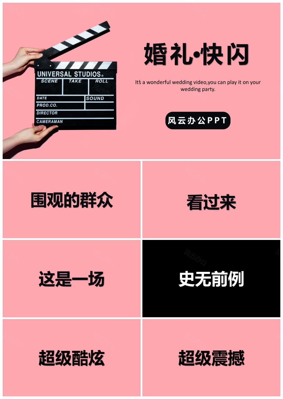 风云办公提供的粉色创意炫酷震撼婚礼开场快闪PPT模板,下载格式为pptx,一共36页,作品中文字及图均可以修改和编辑,图片更改请在作品中右键图片并更换,文字修改请直接点击文字进行修改。