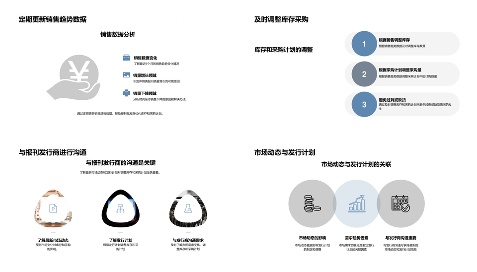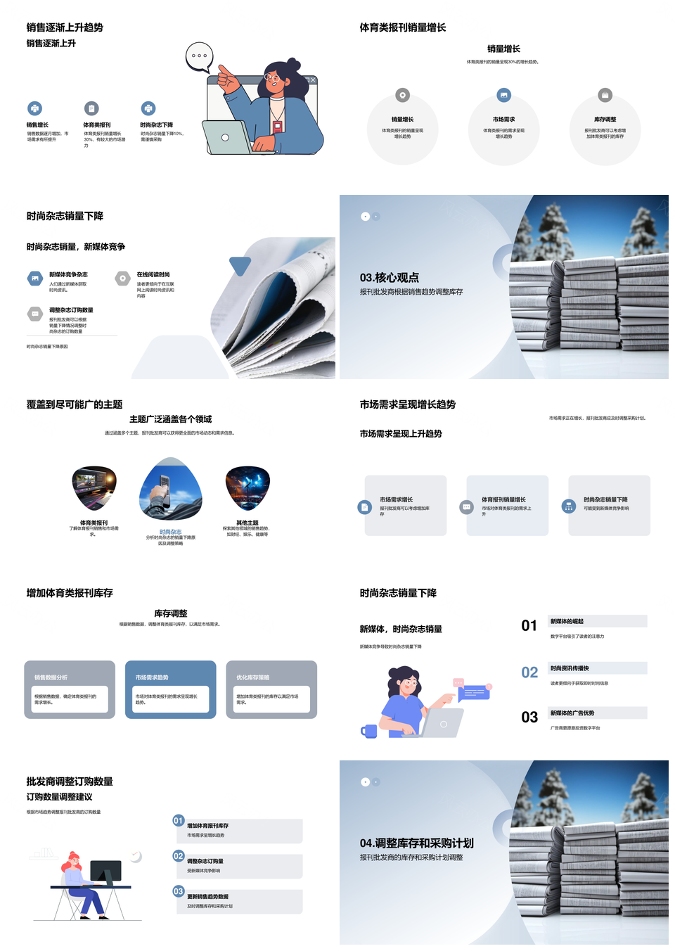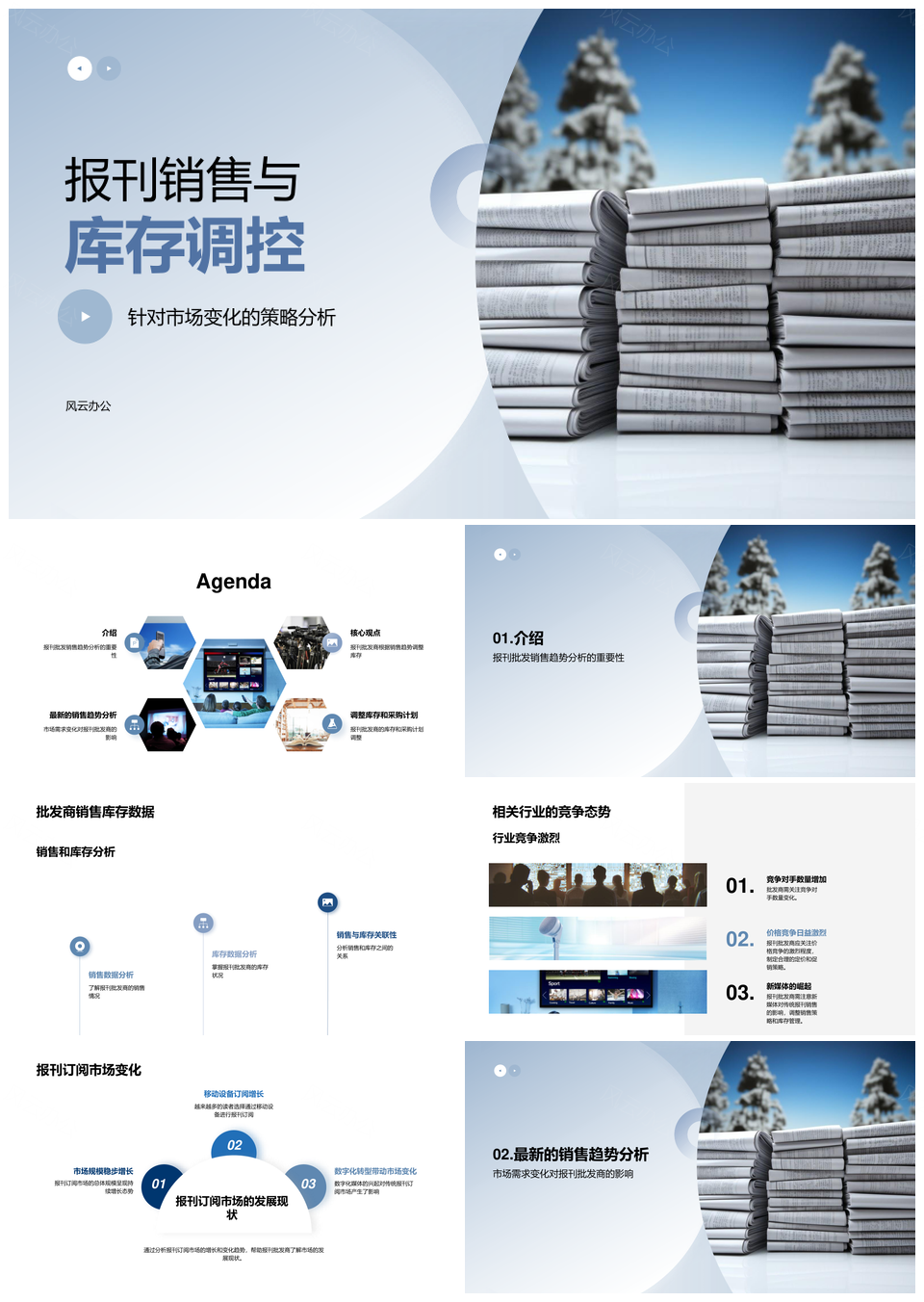 风云办公提供的报刊销售库存调控与市场采购策略动态PPT模板,下载格式为pptx,一共22页,作品中文字及图均可以修改和编辑,图片更改请在作品中右键图片并更换,文字修改请直接点击文字进行修改。