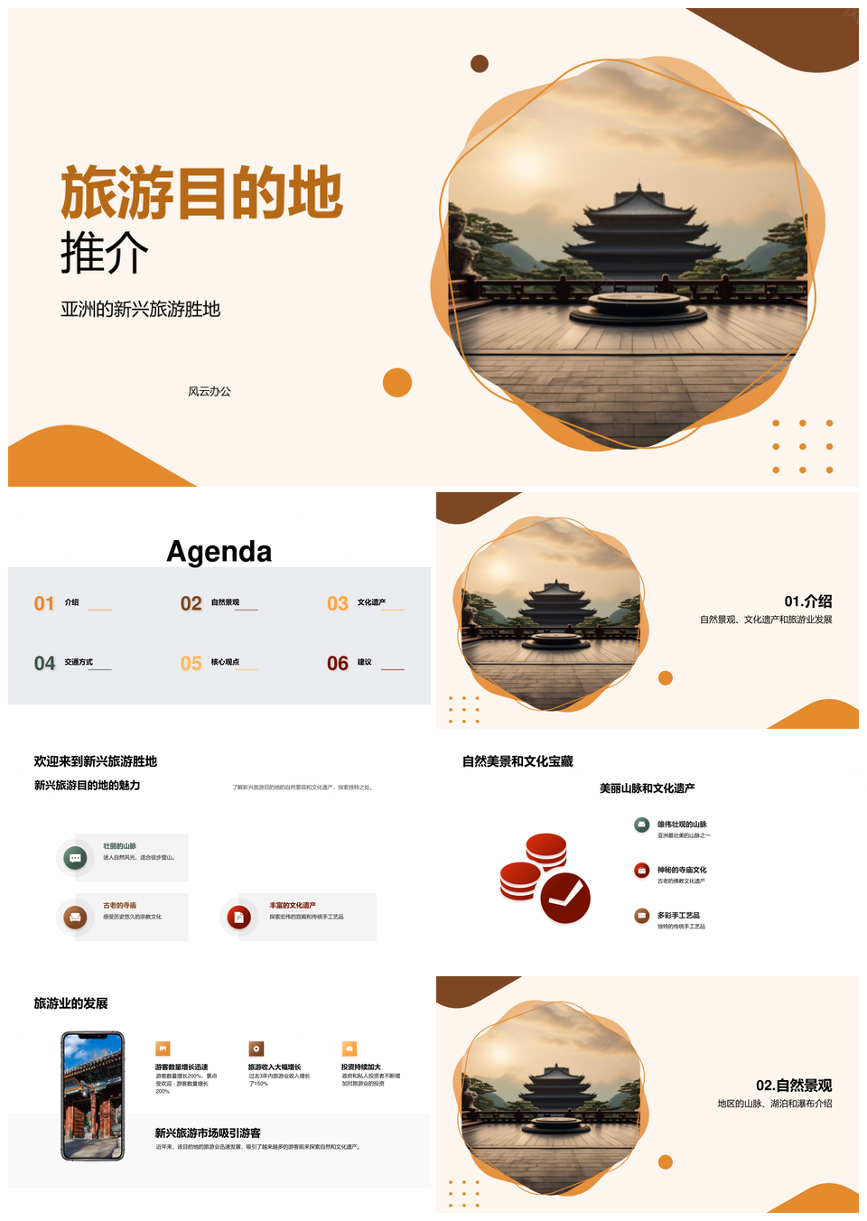 这是一张亚洲新兴旅游胜地山水文化遗产发展推介PPT模板,包含亚洲、新兴、旅游胜地、山水、文化遗产、发展、推介等主题内容,也可用作亚洲新兴旅游胜地、新兴旅游胜地山水、旅游胜地山水文化、胜地山水文化遗产、山水文化遗产发展、文化遗产发展推介、亚洲新兴旅游、新兴旅游胜地、旅游胜地山水、胜地山水文化、山水文化遗产、文化遗产发展、遗产发展推介、旅游胜地、山水文化、文化遗产、遗产发展、发展推介等PPT场景使用。 风云办公提供的亚洲新兴旅游胜地山水文化遗产发展推介PPT模板,下载格式为pptx,一共27页,作品中文字及图均可以修改和编辑,图片更改请在作品中右键图片并更换,文字修改请直接点击文字进行修改。