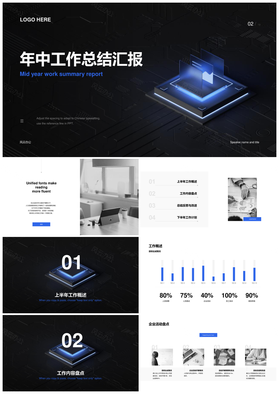 风云办公提供的科技芯片蓝黑灯光年终汇报PPT模板,下载格式为pptx,一共15页,作品中文字及图均可以修改和编辑,图片更改请在作品中右键图片并更换,文字修改请直接点击文字进行修改。