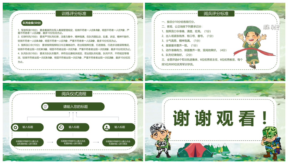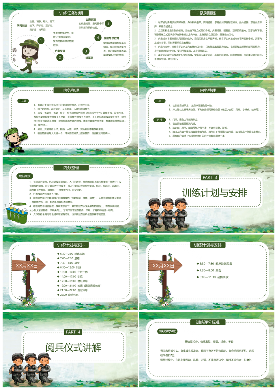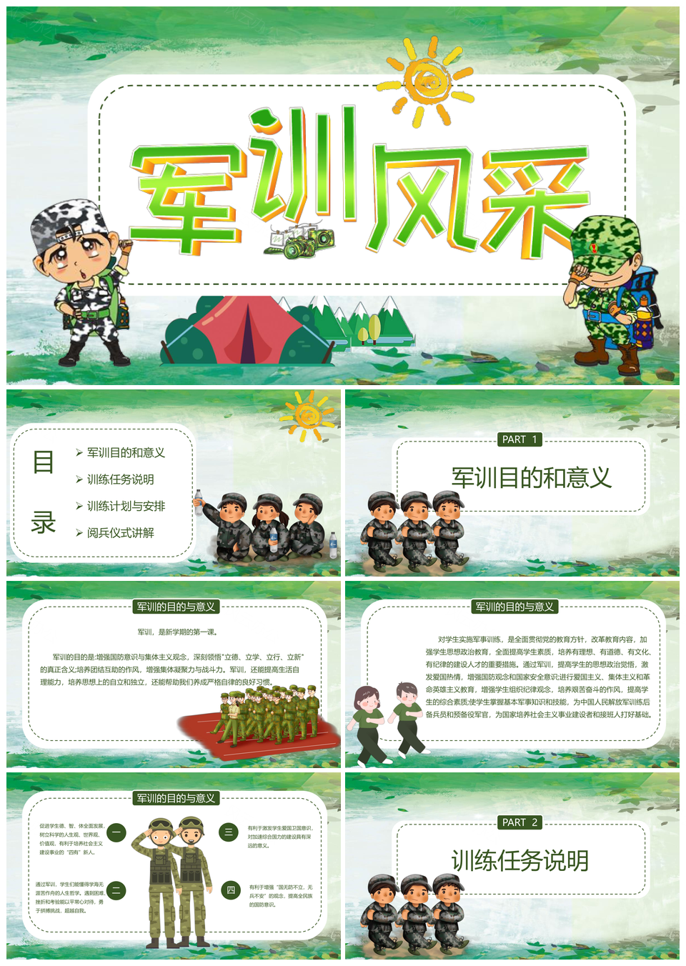 这是一张卡通新生军训介绍PPT模板,包含卡通、新生、军训、介绍等主题内容,也可用作提取的词:卡通、新生、军训、介绍 组成的短语:卡通新生军训介绍、卡通新生军训、卡通新生介绍、卡通军训介绍、新生军训介绍、卡通新生、卡通军训、新生军训、新生介绍、军训介绍等PPT场景使用。 风云办公提供的卡通新生军训介绍PPT模板,下载格式为pptx,一共21页,作品中文字及图均可以修改和编辑,图片更改请在作品中右键图片并更换,文字修改请直接点击文字进行修改。