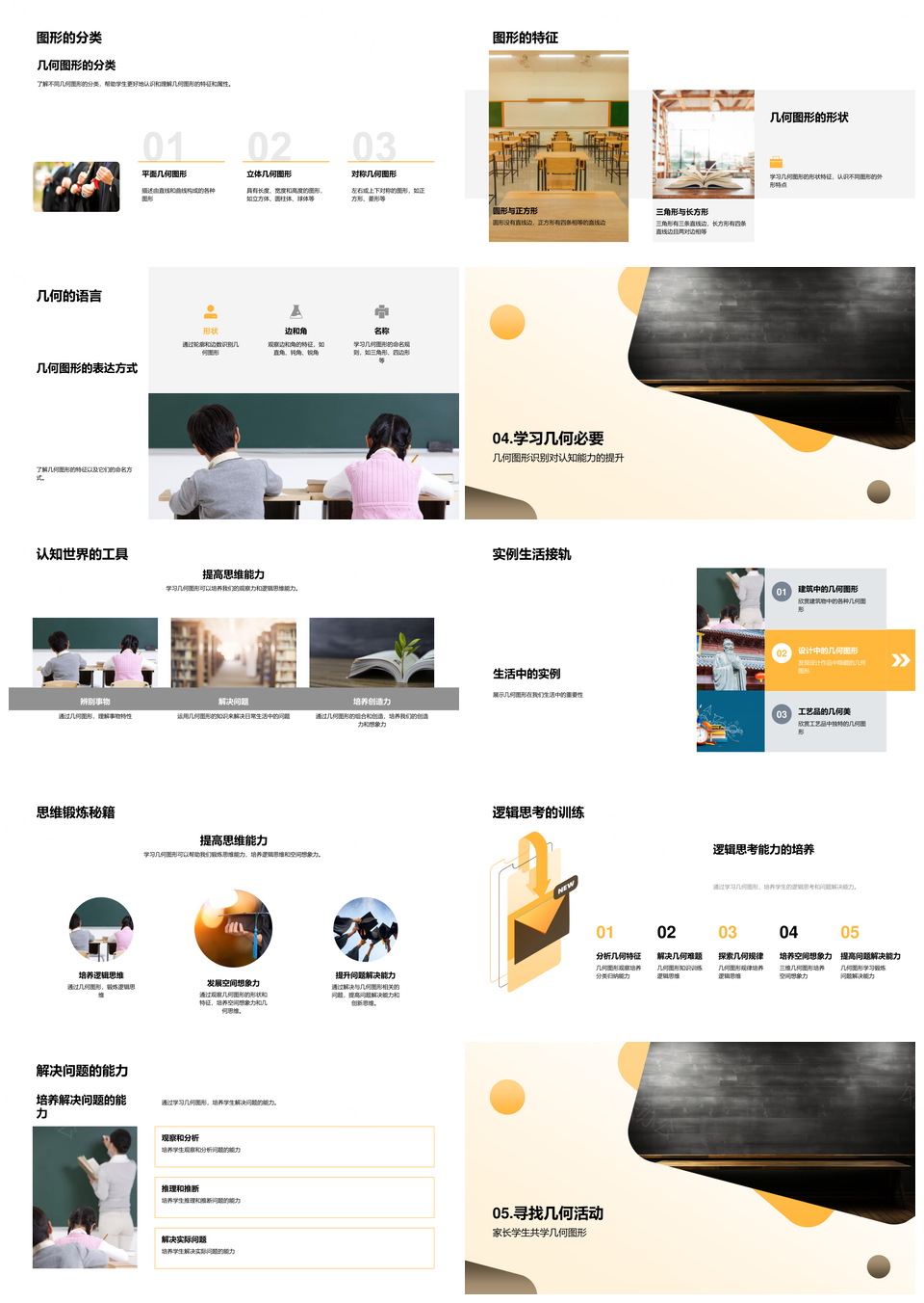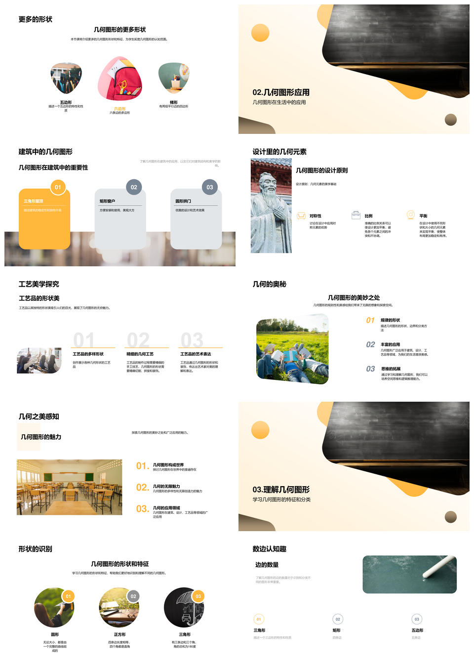 风云办公提供的几何图形教学应用与建筑工艺设计PPT模板,下载格式为pptx,一共33页,作品中文字及图均可以修改和编辑,图片更改请在作品中右键图片并更换,文字修改请直接点击文字进行修改。