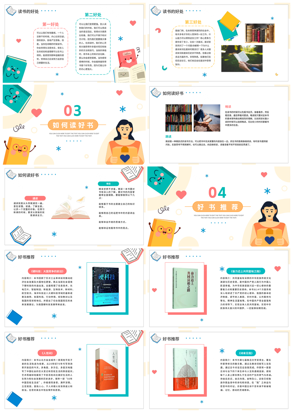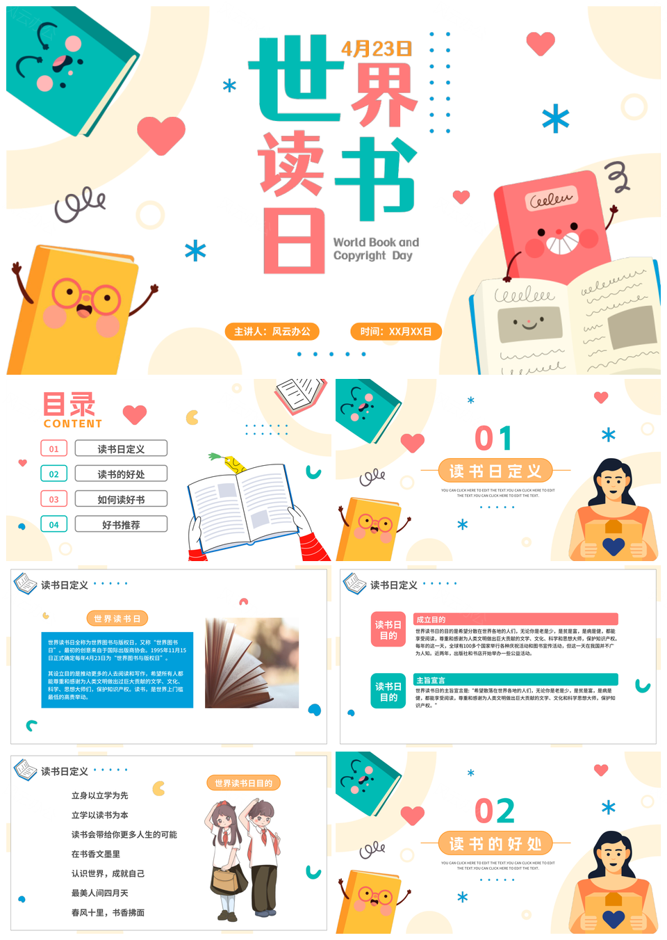 风云办公提供的卡通手绘世界读书日阅读好书推荐科普PPT模板,下载格式为pptx,一共18页,作品中文字及图均可以修改和编辑,图片更改请在作品中右键图片并更换,文字修改请直接点击文字进行修改。