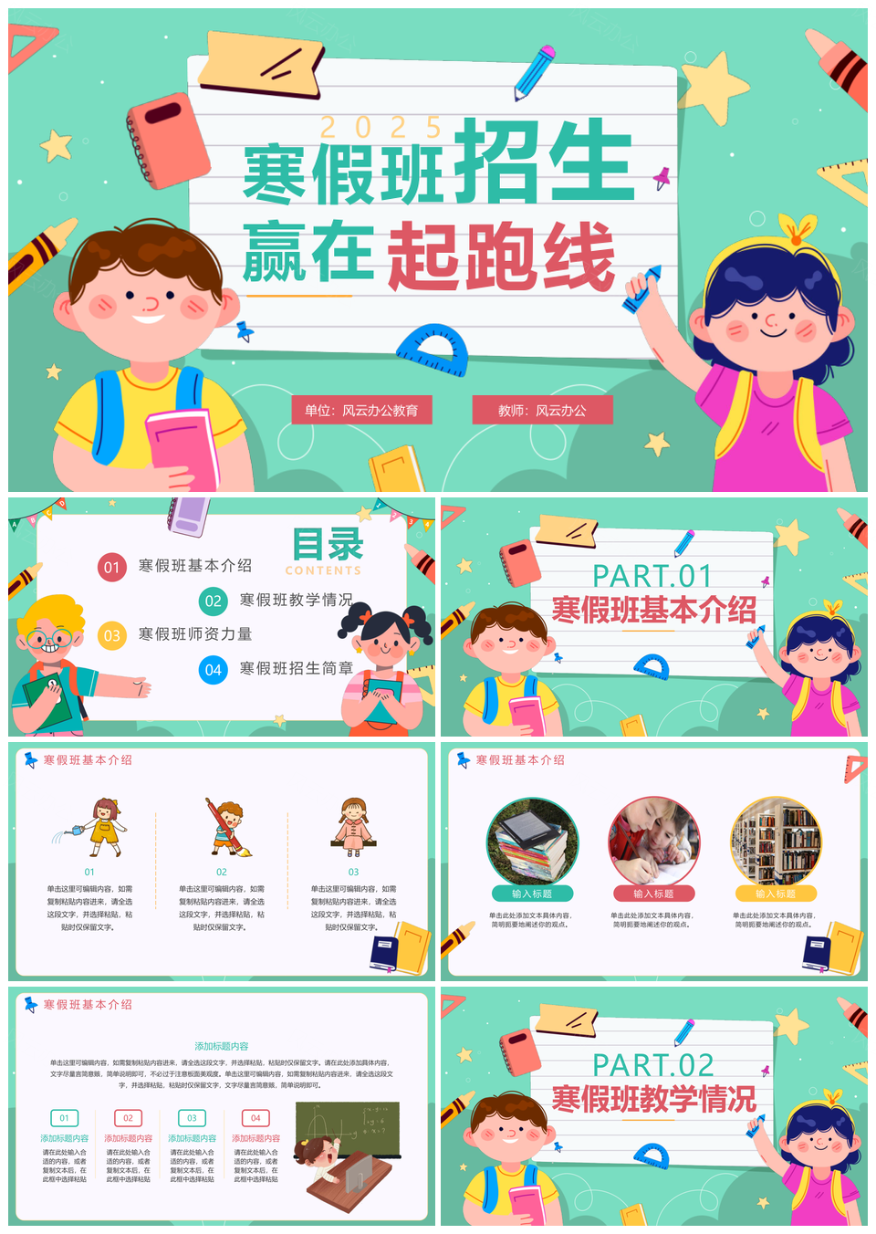 这是一张2025手绘卡通儿童寒假班教育招生教学PPT模板,包含2025、手绘、卡通、儿童、寒假班、教育、招生、教学等主题内容,也可用作手绘卡通儿童寒假班、卡通儿童寒假班教育、儿童寒假班教育招生、寒假班教育招生教学、手绘卡通寒假班招生、卡通寒假班招生教学、手绘卡通教育招生、卡通儿童教育招生、儿童寒假班招生教学、寒假班教育招生、手绘卡通寒假班、卡通儿童寒假班、手绘教育招生、寒假班招生、卡通教育招生等PPT场景使用。 风云办公提供的2025手绘卡通儿童寒假班教育招生教学PPT模板,下载格式为pptx,一共19页,作品中文字及图均可以修改和编辑,图片更改请在作品中右键图片并更换,文字修改请直接点击文字进行修改。