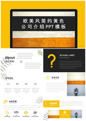 风云办公提供的黄色简约欧美风企业介绍PPT模板,下载格式为pptx,一共20页,作品中文字及图均可以修改和编辑,图片更改请在作品中右键图片并更换,文字修改请直接点击文字进行修改。
