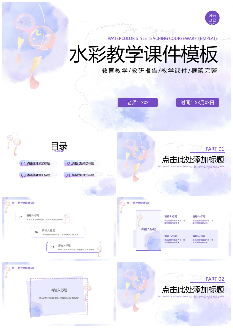 简约清新水彩手绘教学PPT紫色渐变插画创意时尚
