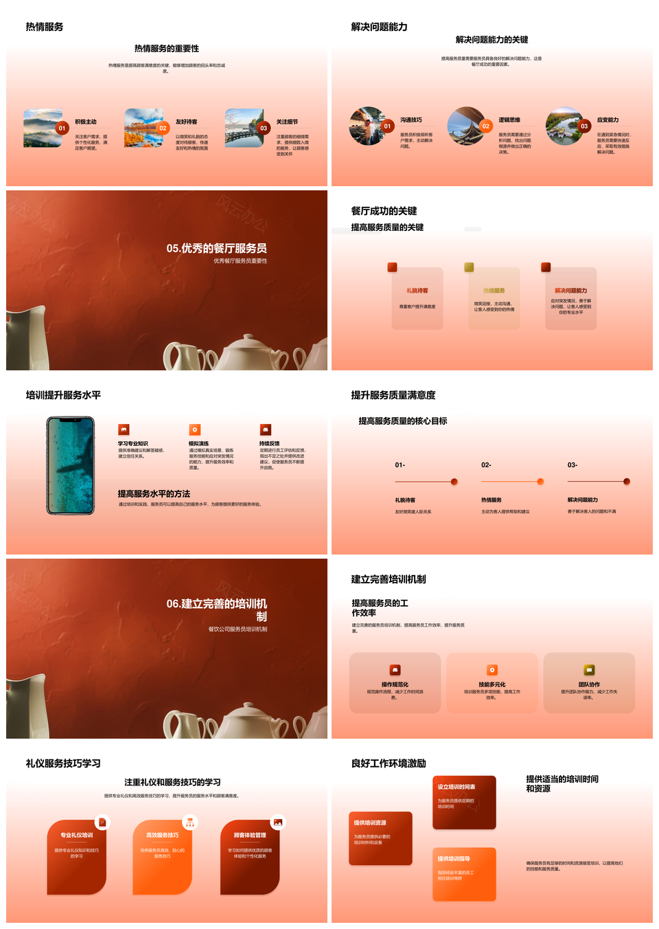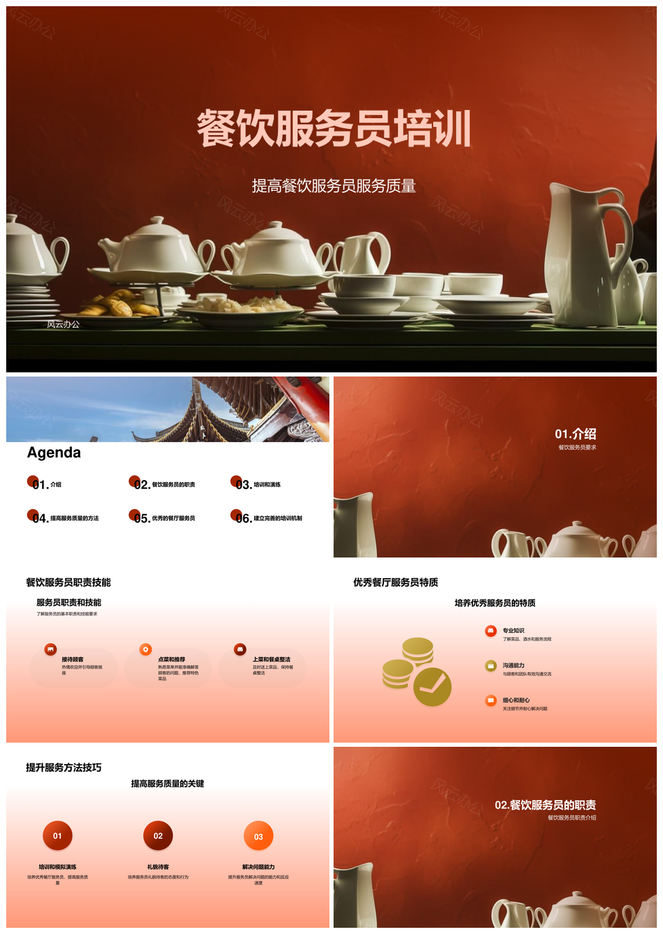 风云办公提供的餐饮服务员服务质量技能职责培训提升PPT模板,下载格式为pptx,一共29页,作品中文字及图均可以修改和编辑,图片更改请在作品中右键图片并更换,文字修改请直接点击文字进行修改。