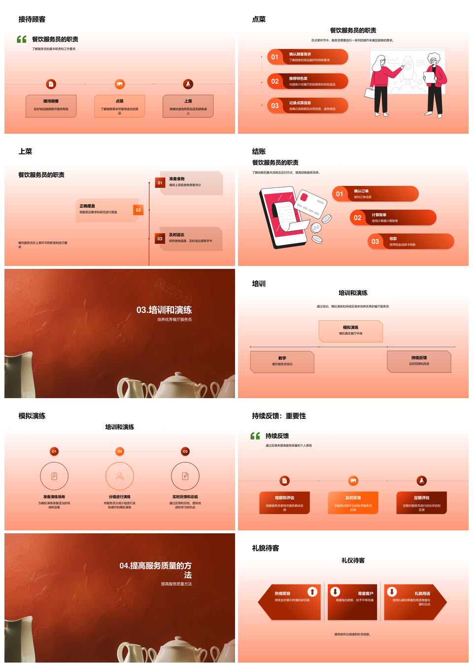这是一张餐饮服务员服务质量技能职责培训提升PPT模板,包含餐饮服务员、服务质量、技能、职责、培训、提升等主题内容,也可用作餐饮服务员服务质量技能职责、服务质量技能职责培训、技能职责培训提升、餐饮服务员服务质量技能、服务质量技能职责、技能职责培训、职责培训提升、餐饮服务员培训提升、服务质量技能培训、技能培训提升、服务质量职责培训、餐饮服务员技能职责、服务质量培训提升、服务质量职责、技能培训、餐饮服务员服务质量、服务质量技能、技能职责、职责培训、培训提升等PPT场景使用。