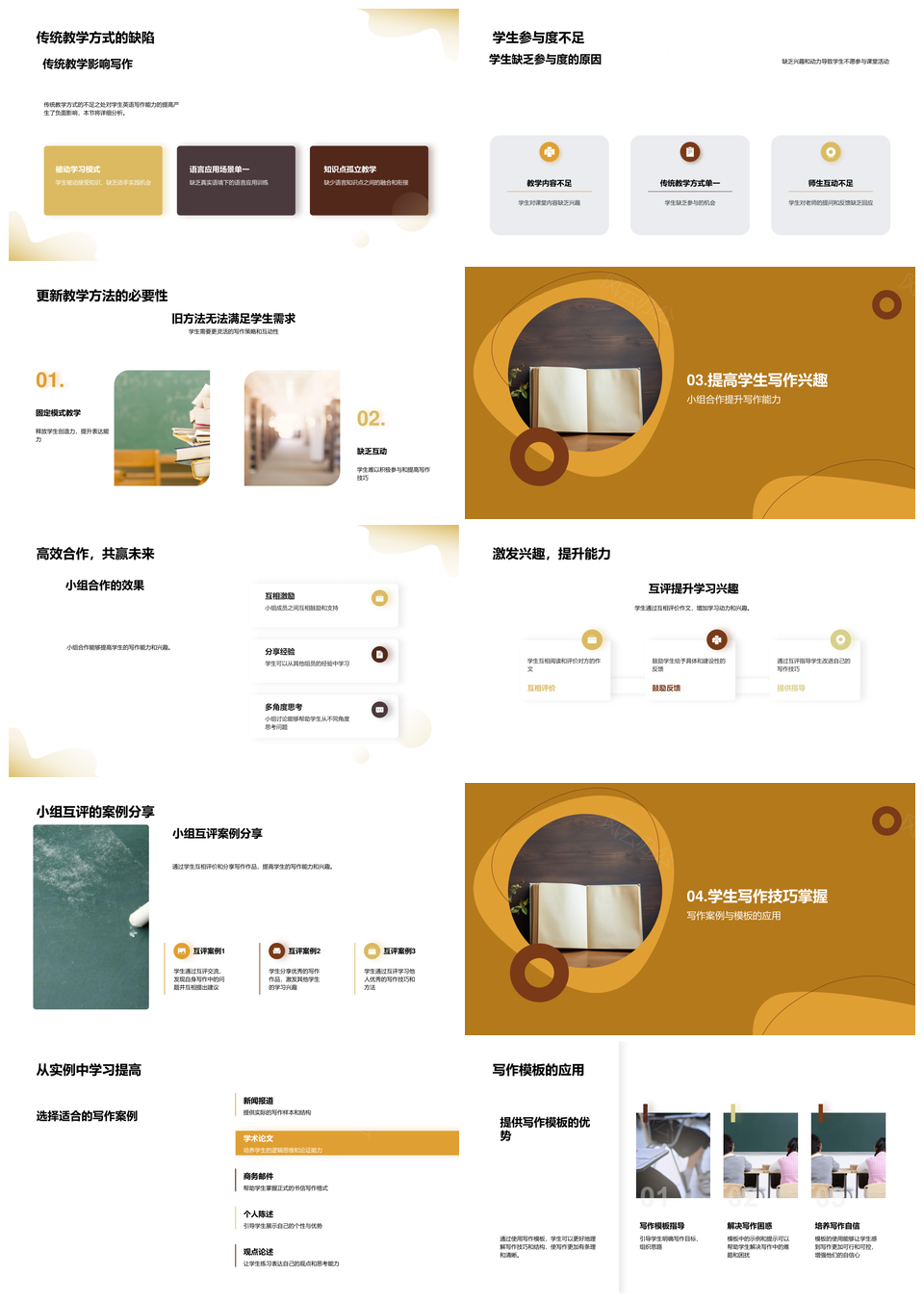 风云办公提供的大学英语写作小组互评创新教学PPT模板,下载格式为pptx,一共23页,作品中文字及图均可以修改和编辑,图片更改请在作品中右键图片并更换,文字修改请直接点击文字进行修改。