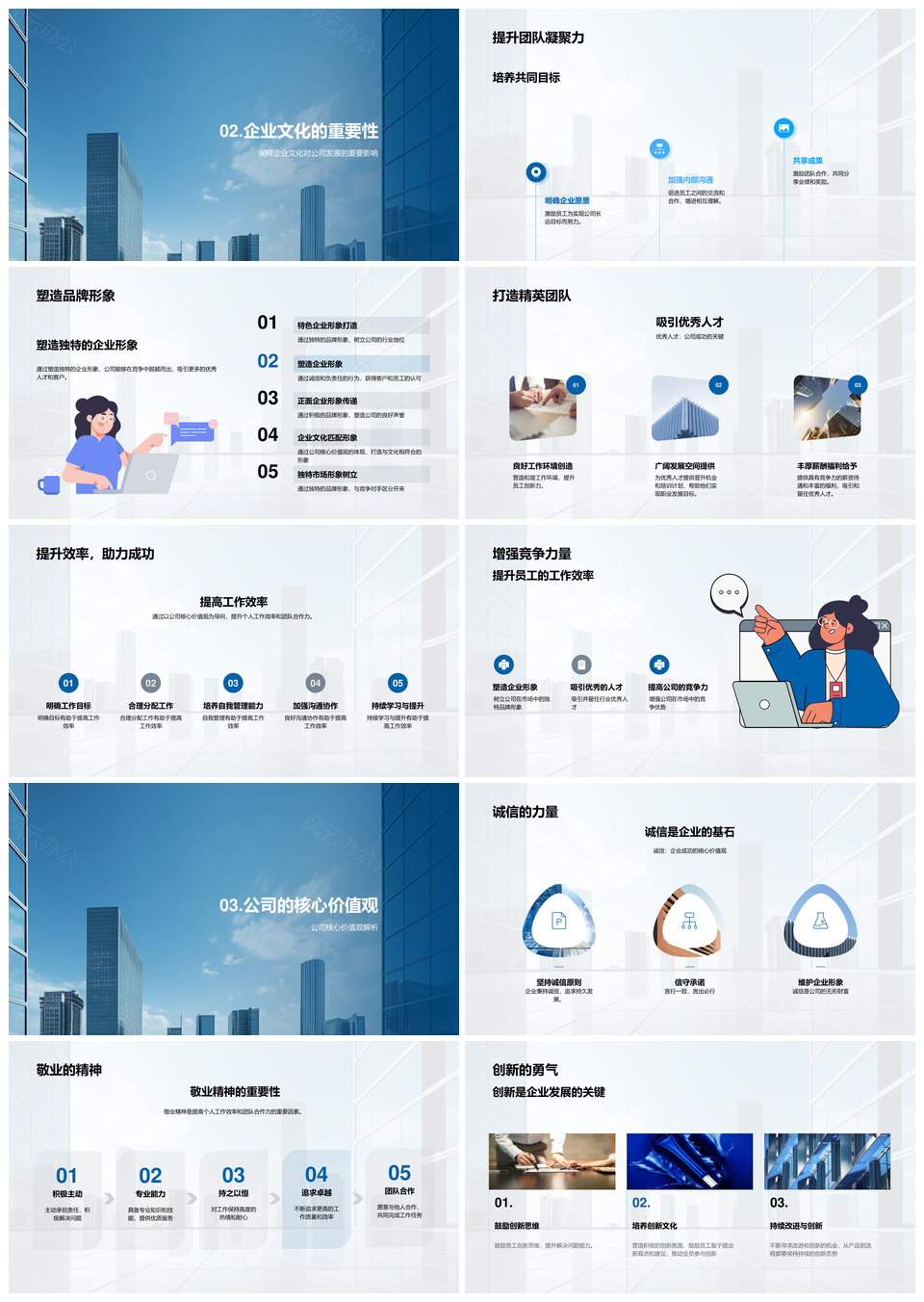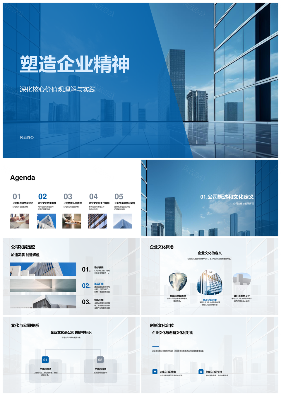 风云办公提供的企业精神核心文化凝聚高效发展形象PPT模板,下载格式为pptx,一共29页,作品中文字及图均可以修改和编辑,图片更改请在作品中右键图片并更换,文字修改请直接点击文字进行修改。