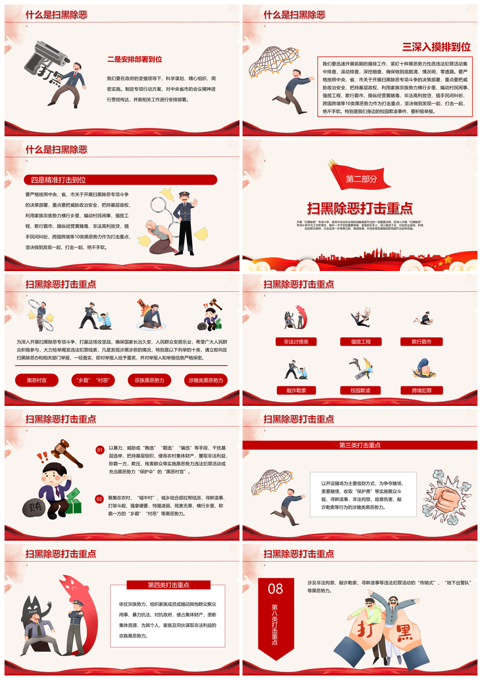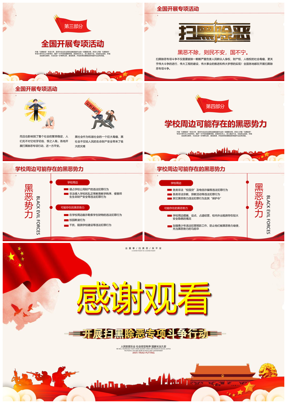 这是一张扫黑除恶打击犯罪班会学习PPT模板,包含扫黑除恶、打击犯罪、班会学习等主题内容,也可用作扫黑除恶、打击犯罪、班会、学习 扫黑除恶打击犯罪班会学习、扫黑除恶打击犯罪班会、扫黑除恶打击犯罪学习、扫黑除恶班会学习、打击犯罪班会学习、扫黑除恶打击犯罪、班会学习等PPT场景使用。 风云办公提供的扫黑除恶打击犯罪班会学习PPT模板,下载格式为pptx,一共25页,作品中文字及图均可以修改和编辑,图片更改请在作品中右键图片并更换,文字修改请直接点击文字进行修改。