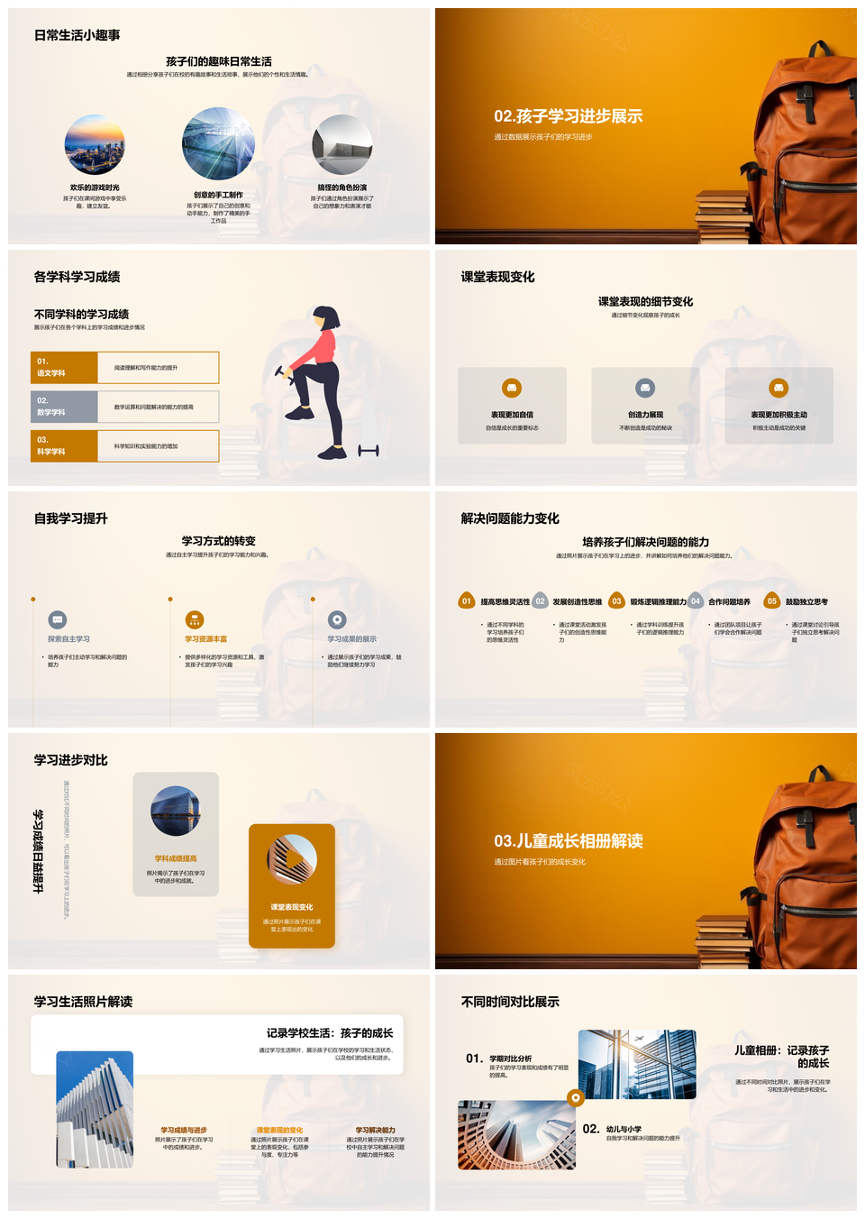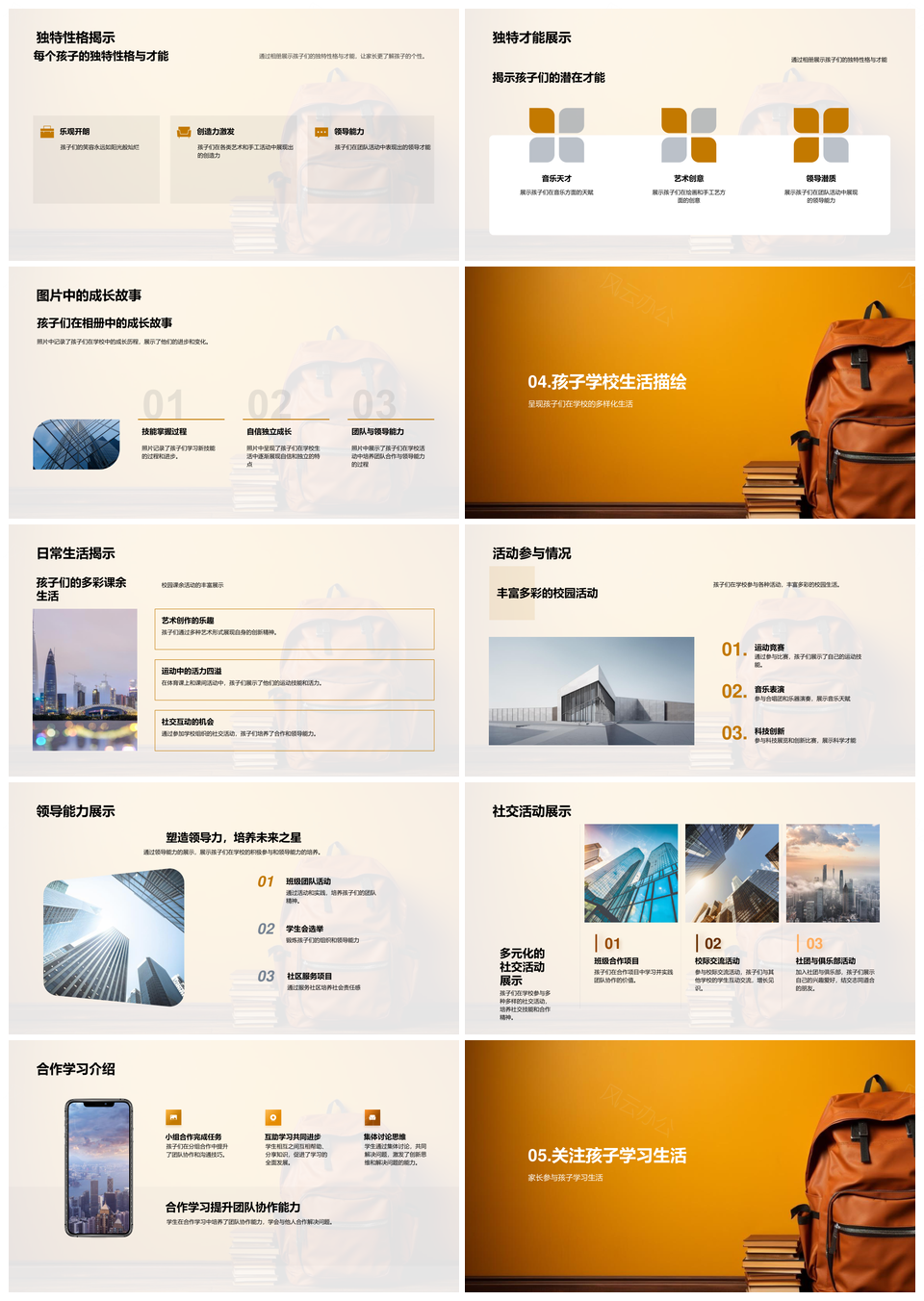 风云办公提供的孩子学习生活家校互动个性成长书包PPT模板,下载格式为pptx,一共33页,作品中文字及图均可以修改和编辑,图片更改请在作品中右键图片并更换,文字修改请直接点击文字进行修改。