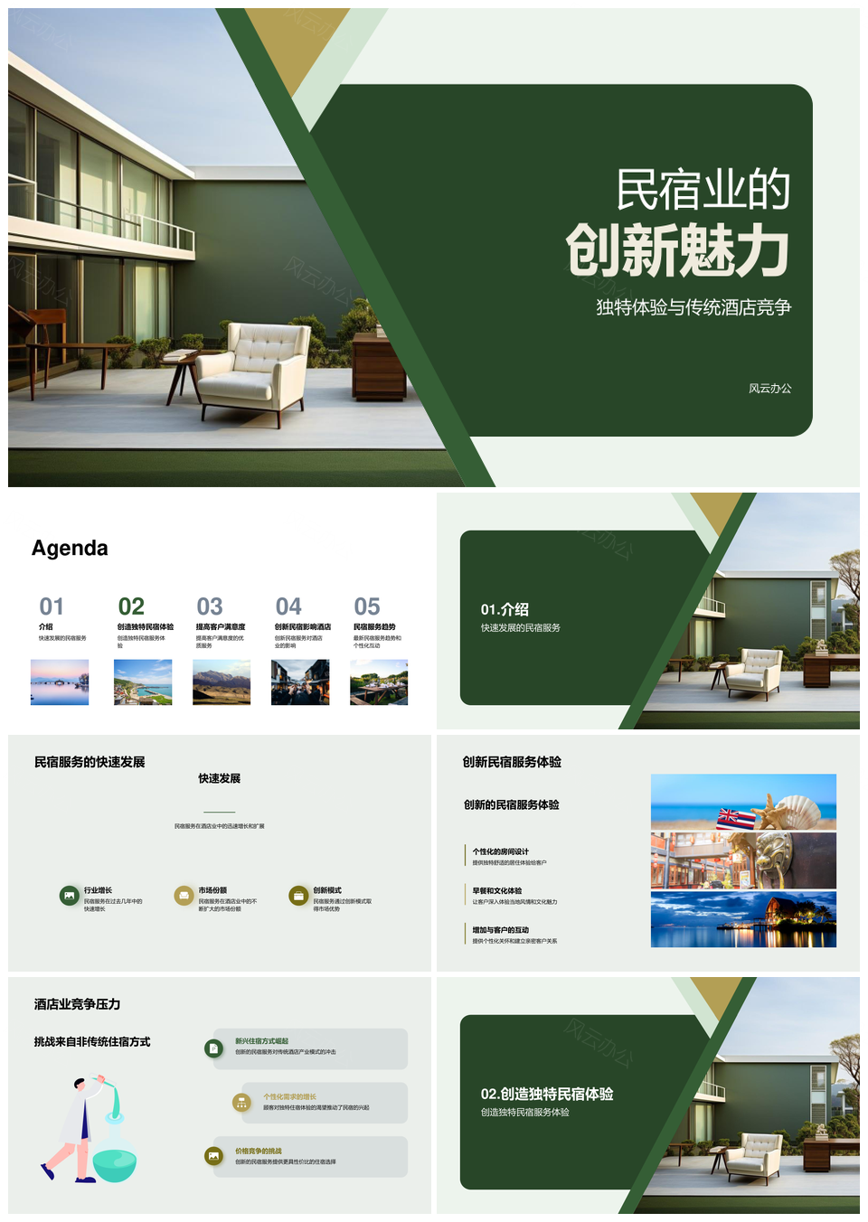 风云办公提供的民宿创新服务冲击酒店业竞争格局PPT模板,下载格式为pptx,一共23页,作品中文字及图均可以修改和编辑,图片更改请在作品中右键图片并更换,文字修改请直接点击文字进行修改。