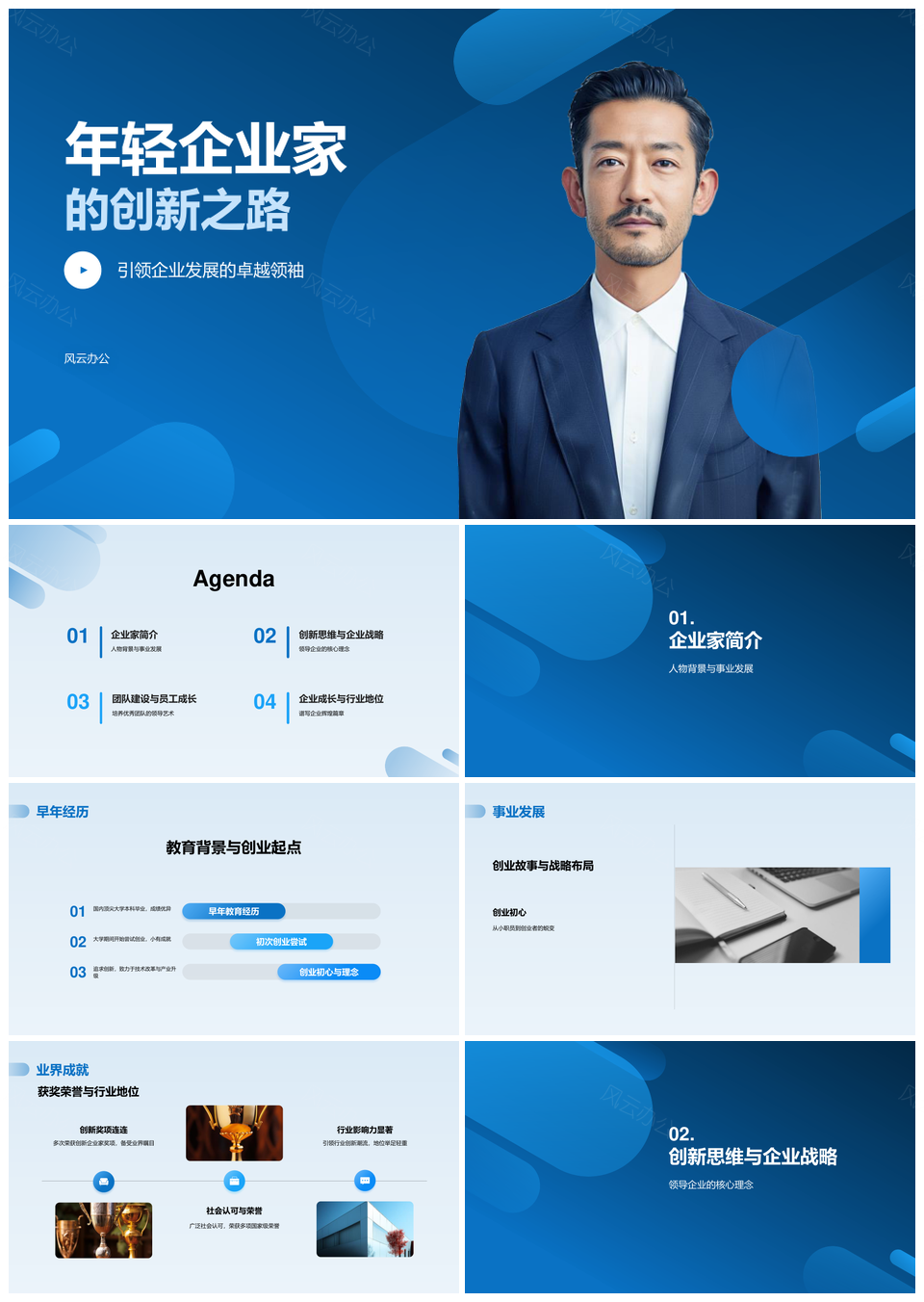 风云办公提供的企业成功人士杰出辉煌人生历程PPT模板,下载格式为pptx,一共21页,作品中文字及图均可以修改和编辑,图片更改请在作品中右键图片并更换,文字修改请直接点击文字进行修改。