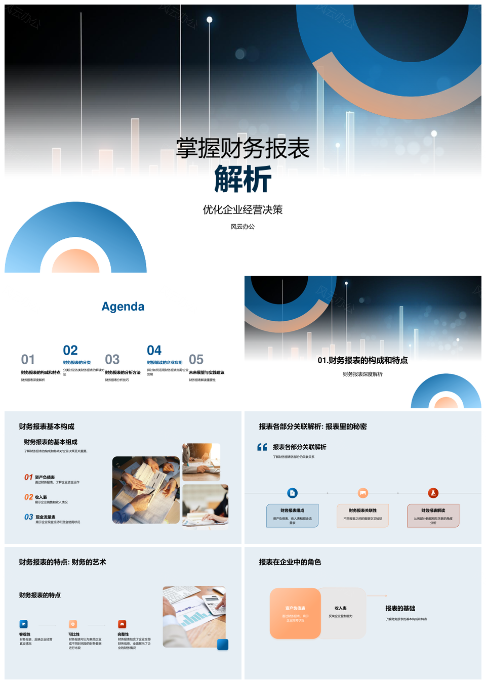 风云办公提供的财务报表解析三表驱动企业决策分析PPT模板,下载格式为pptx,一共25页,作品中文字及图均可以修改和编辑,图片更改请在作品中右键图片并更换,文字修改请直接点击文字进行修改。