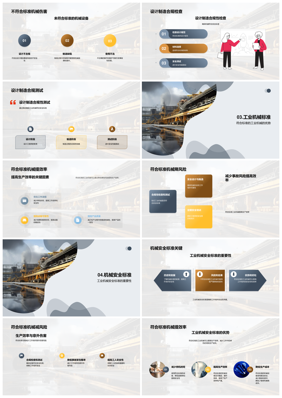 这是一张工业机械安全标准历史发展培训设计风险优势PPT模板,包含工业、机械、安全、标准、历史、发展、培训、设计、风险、优势等主题内容,也可用作工业机械安全标准、安全标准历史发展、机械安全标准发展、历史发展培训设计、培训设计风险优势、工业安全标准、机械安全标准、安全标准历史、历史发展培训、培训设计风险、设计风险优势、工业机械、安全标准、历史发展、培训设计等PPT场景使用。 风云办公提供的工业机械安全标准历史发展培训设计风险优势PPT模板,下载格式为pptx,一共22页,作品中文字及图均可以修改和编辑,图片更改请在作品中右键图片并更换,文字修改请直接点击文字进行修改。