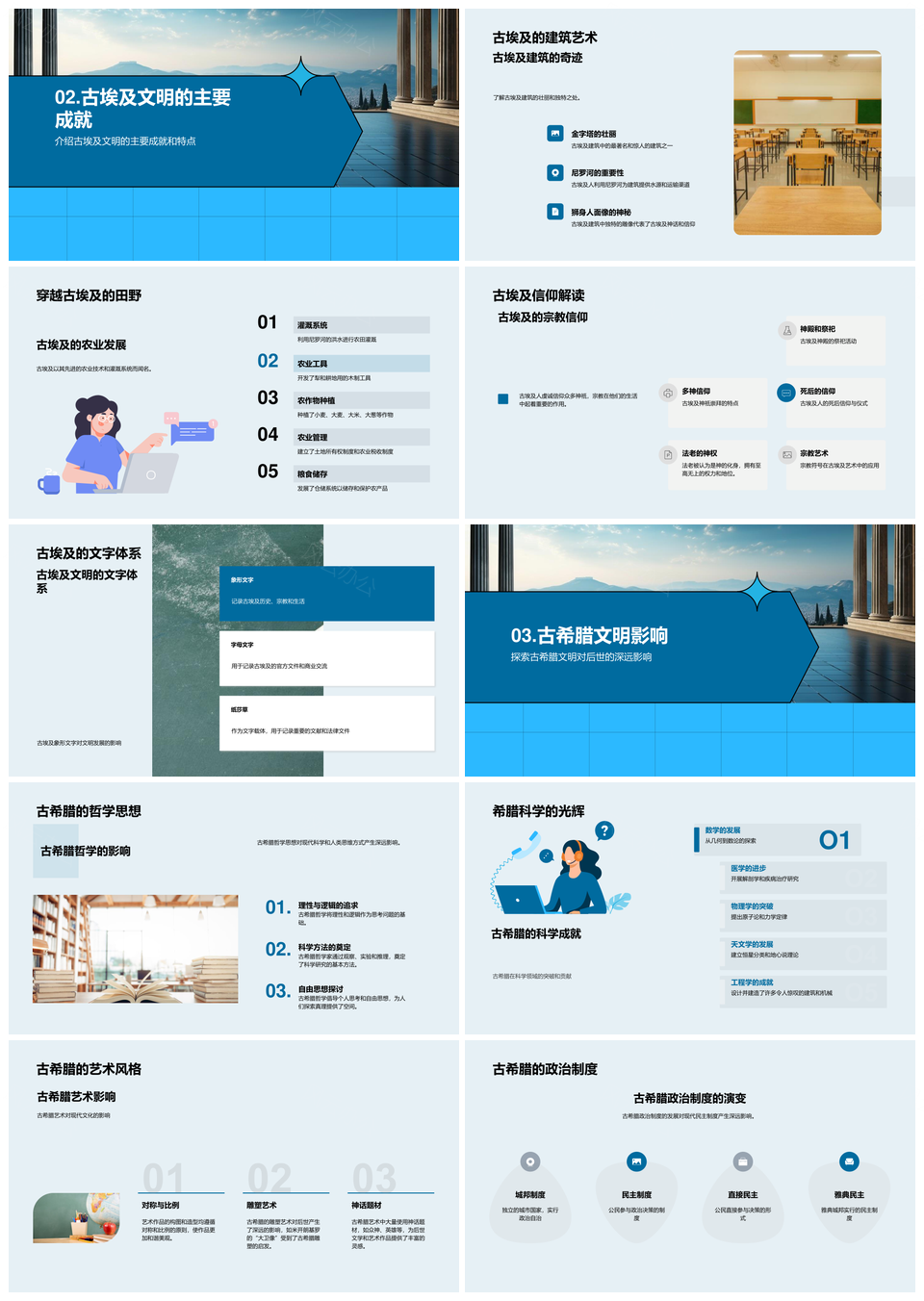 风云办公提供的古埃及希腊罗马科技哲艺法文明辉迹PPT模板,下载格式为pptx,一共26页,作品中文字及图均可以修改和编辑,图片更改请在作品中右键图片并更换,文字修改请直接点击文字进行修改。