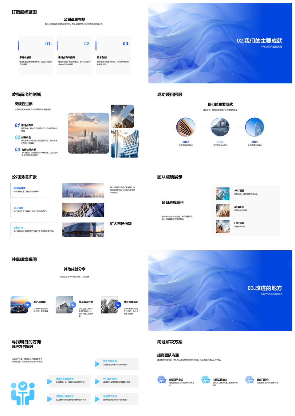 这是一张年中业绩突破进展策略扩张解困下半年目标展望PPT模板,包含年中、业绩、突破、进展、策略、扩张、解困、下半年、目标、展望等主题内容,也可用作年中业绩突破进展、业绩突破进展策略、突破进展策略扩张、进展策略扩张解困、策略扩张解困下半年、扩张解困下半年目标、解困下半年目标展望、年中业绩突破、业绩突破进展、突破进展策略、进展策略扩张、策略扩张解困、扩张解困下半年、解困下半年目标、下半年目标展望等PPT场景使用。 风云办公提供的年中业绩突破进展策略扩张解困下半年目标展望PPT模板,下载格式为pptx,一共33页,作品中文字及图均可以修改和编辑,图片更改请在作品中右键图片并更换,文字修改请直接点击文字进行修改。