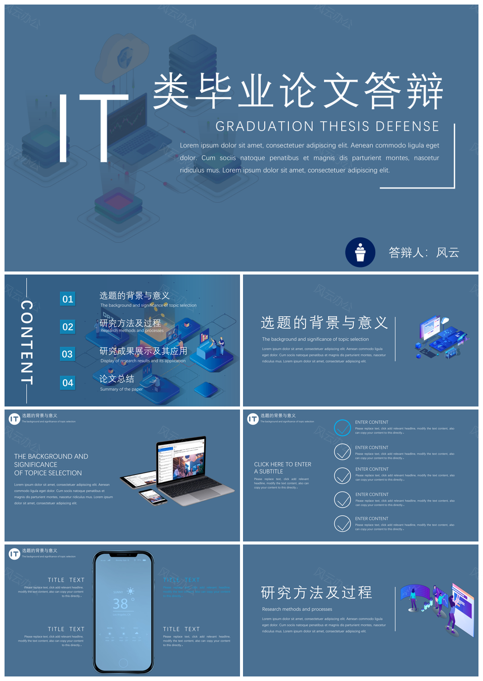 这是一张蓝色IT类毕业论文答辩PPT模板,包含蓝色、IT类、毕业论文、答辩等主题内容,也可用作蓝色IT类毕业论文答辩、蓝色IT类毕业论文、IT类毕业论文答辩、蓝色IT类、IT类毕业论文、毕业论文答辩、蓝色毕业论文等PPT场景使用。 风云办公提供的蓝色IT类毕业论文答辩PPT模板,下载格式为pptx,一共18页,作品中文字及图均可以修改和编辑,图片更改请在作品中右键图片并更换,文字修改请直接点击文字进行修改。