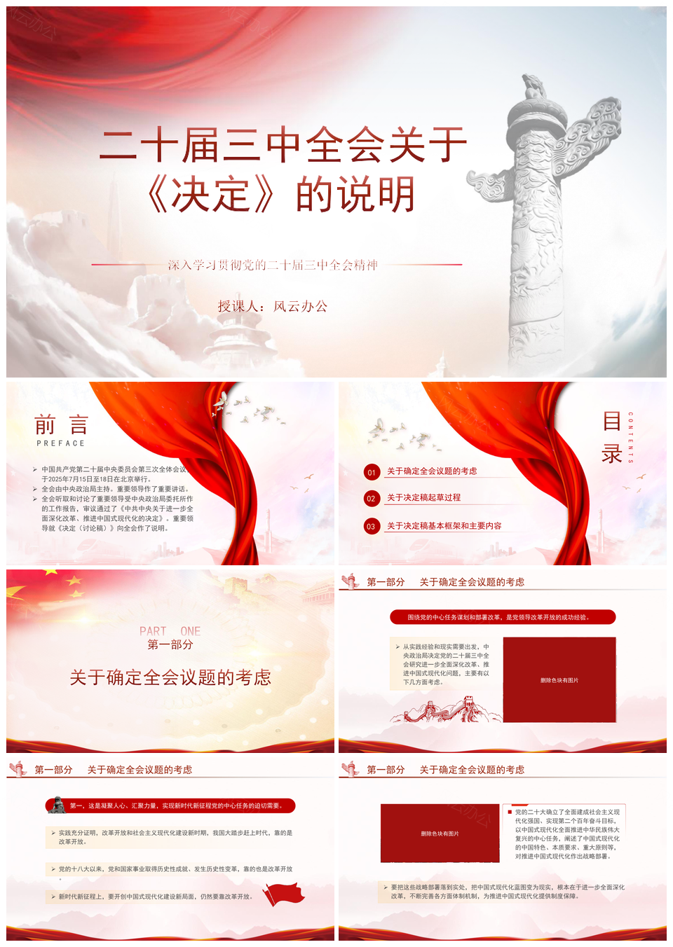风云办公提供的2025二十届三中全会决定说明专题党课课件,下载格式为pptx,一共32页,作品中文字及图均可以修改和编辑,图片更改请在作品中右键图片并更换,文字修改请直接点击文字进行修改。