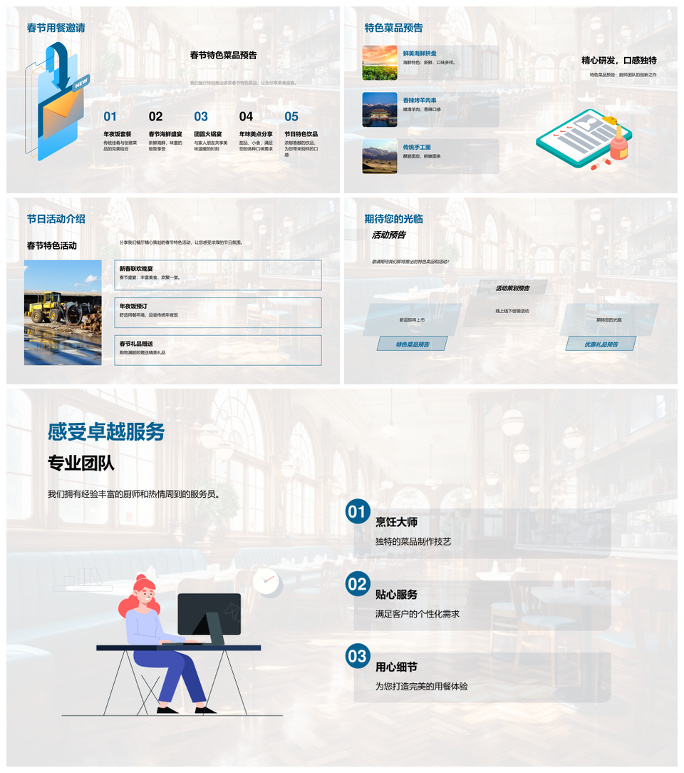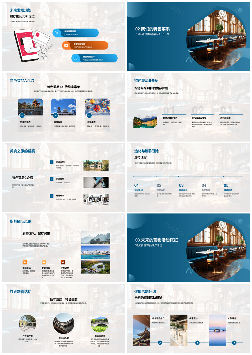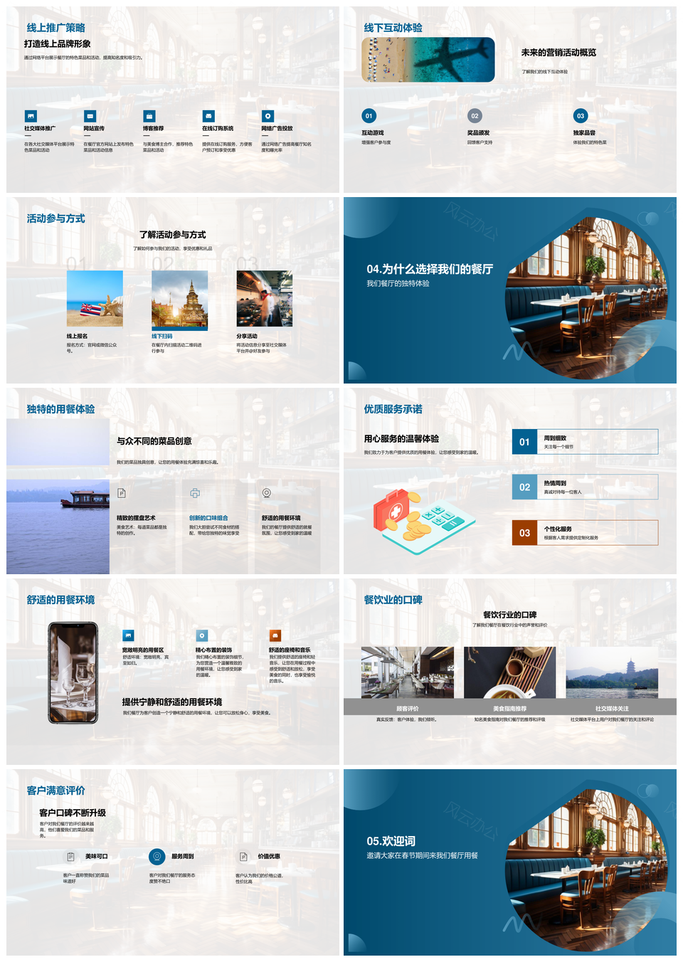 这是一张餐厅历史独特美食特色菜系之旅营销活动策划PPT模板,包含餐厅、历史、独特、美食、特色、菜系、之旅、营销活动、策划等主题内容,也可用作餐厅历史独特美食、历史独特美食特色菜系、独特美食特色菜系之旅、美食特色菜系之旅营销活动、特色菜系之旅营销活动策划、餐厅历史独特、历史独特美食、独特美食特色菜系、美食特色菜系之旅、特色菜系之旅营销活动、餐厅历史、历史独特、独特美食、营销活动策划、特色菜系之旅等PPT场景使用。 风云办公提供的餐厅历史独特美食特色菜系之旅营销活动策划PPT模板,下载格式为pptx,一共33页,作品中文字及图均可以修改和编辑,图片更改请在作品中右键图片并更换,文字修改请直接点击文字进行修改。