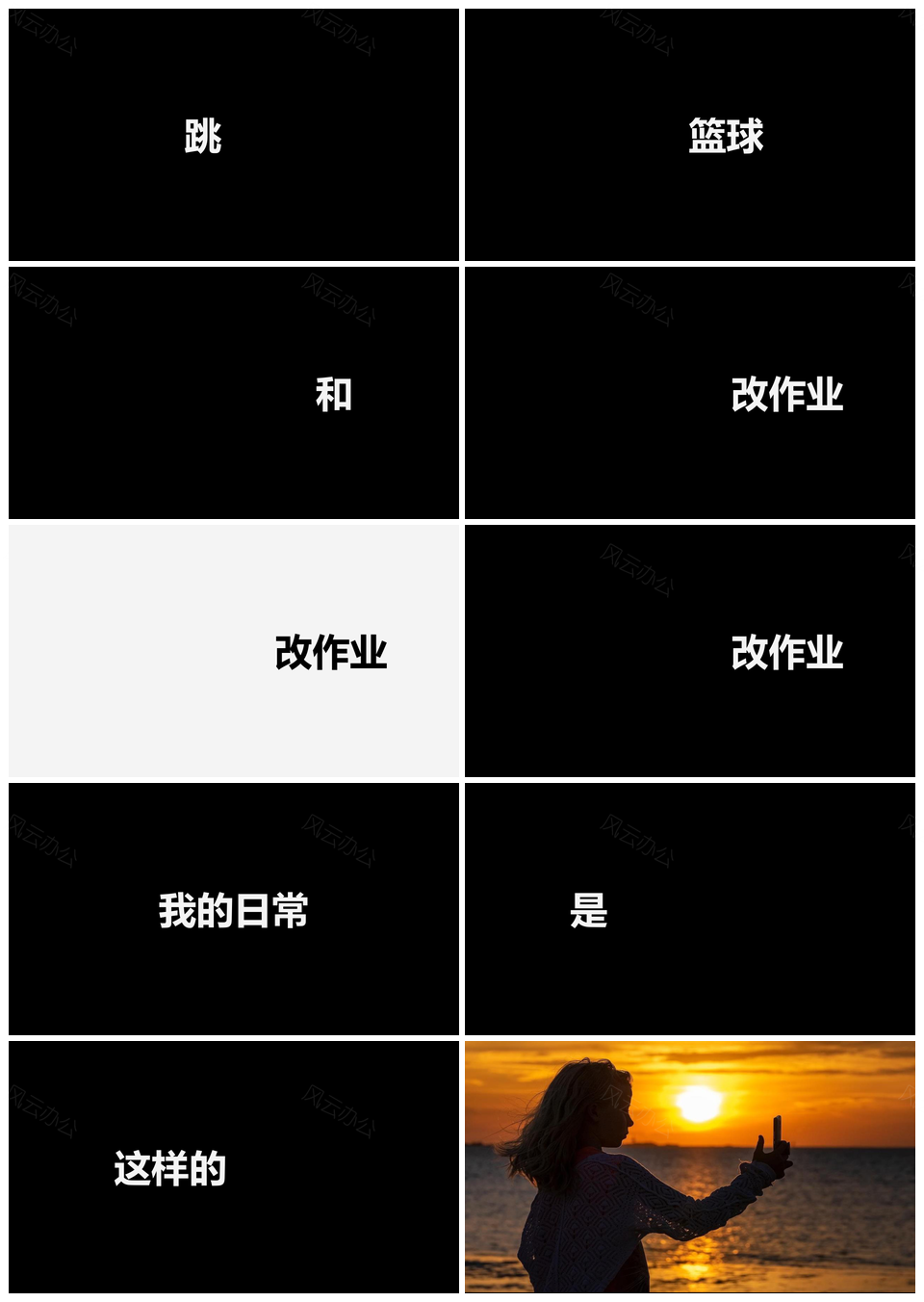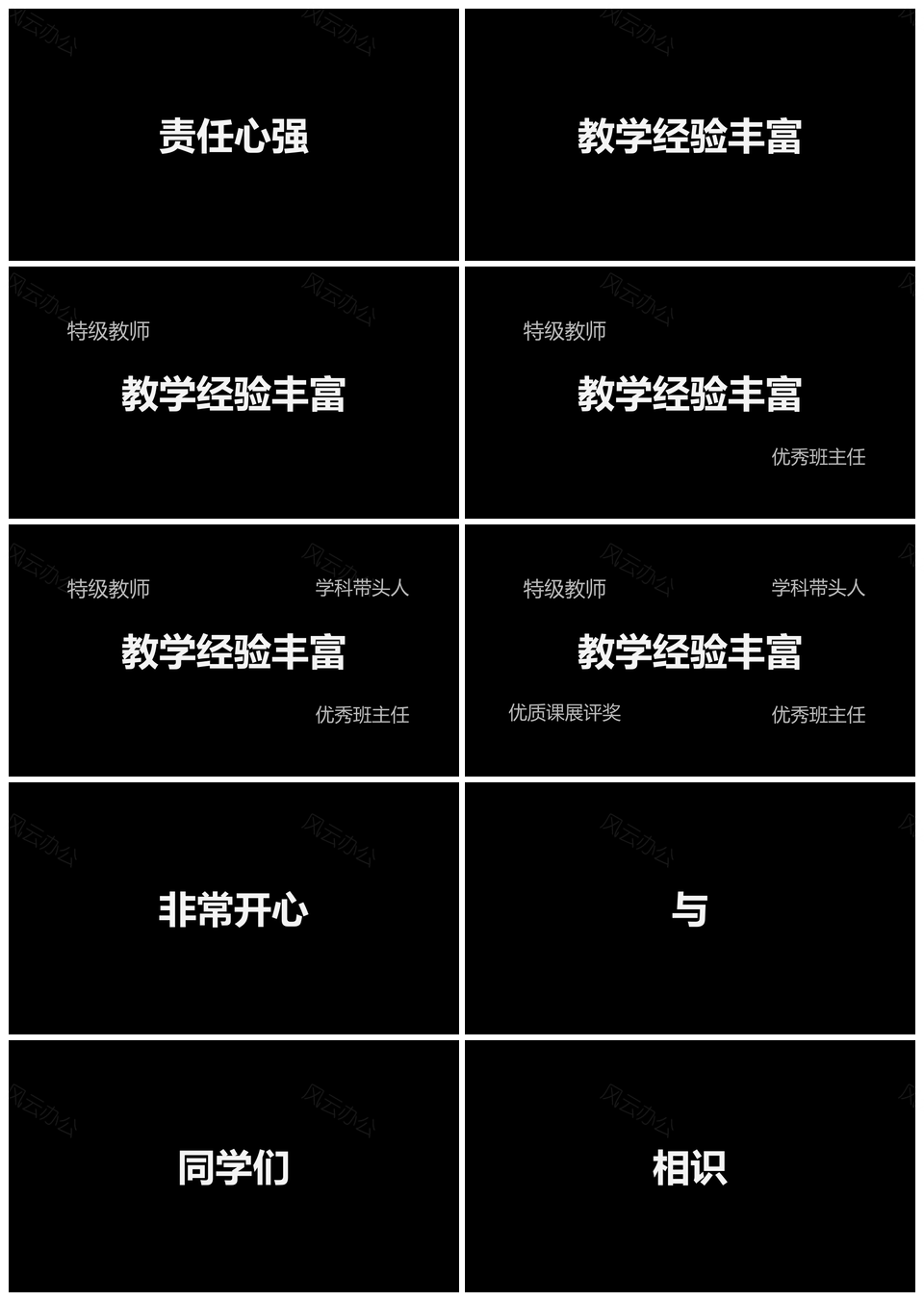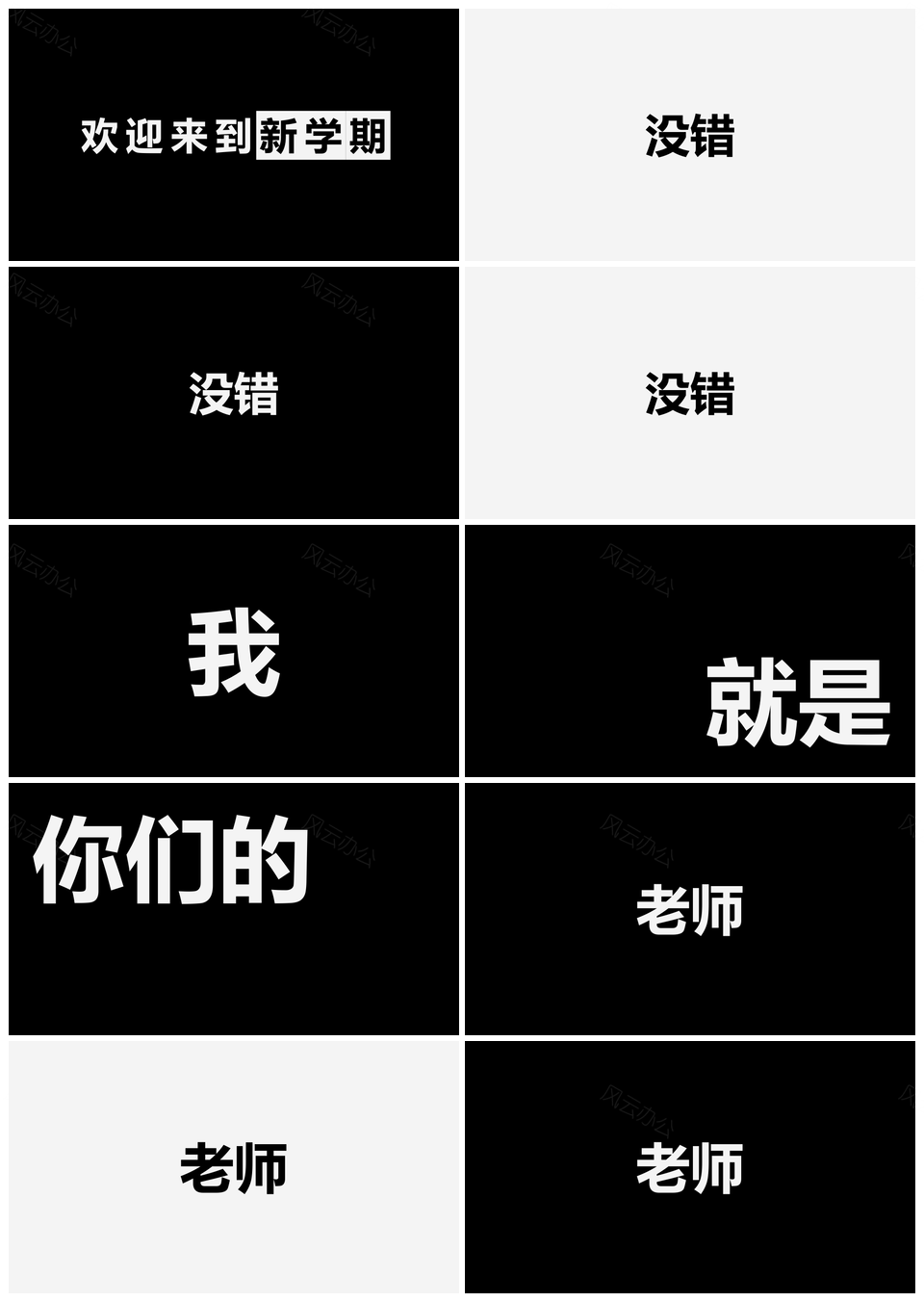 风云办公提供的黑白快闪教师自我介绍动画音频PPT模板,下载格式为pptx,一共102页,作品中文字及图均可以修改和编辑,图片更改请在作品中右键图片并更换,文字修改请直接点击文字进行修改。