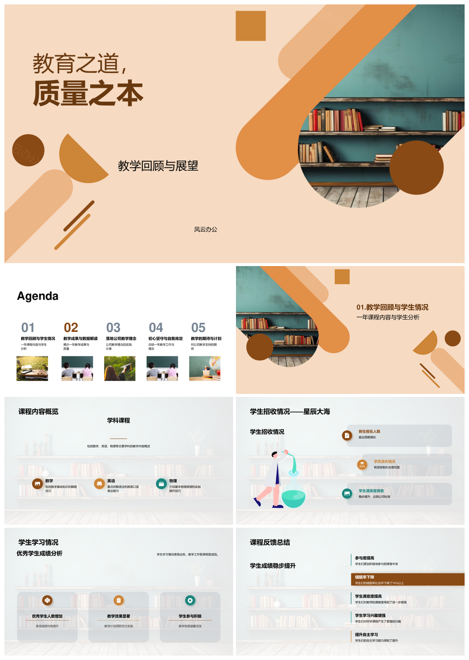 风云办公提供的教育质量为本教学工作回顾展望课程PPT模板,下载格式为pptx,一共29页,作品中文字及图均可以修改和编辑,图片更改请在作品中右键图片并更换,文字修改请直接点击文字进行修改。