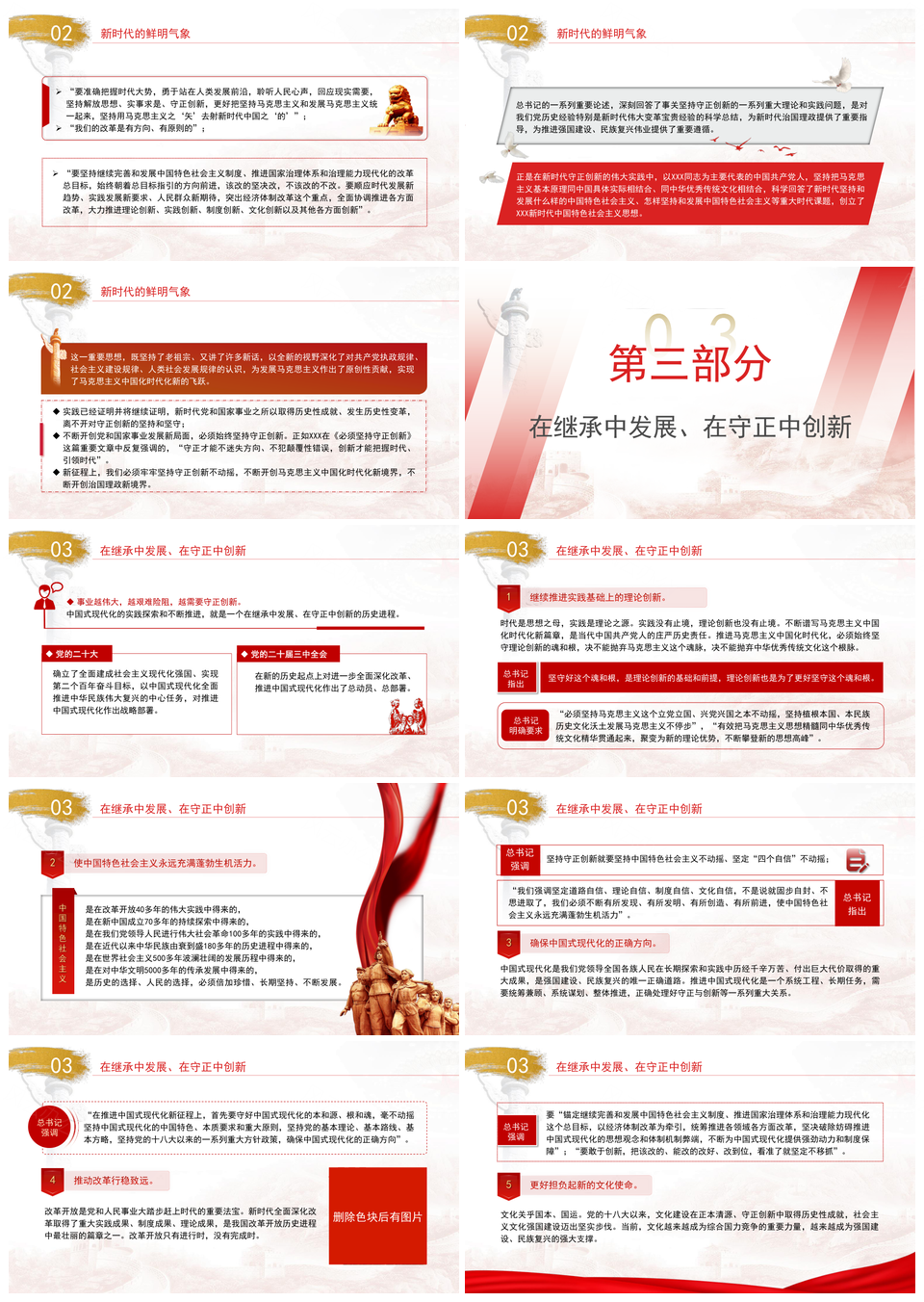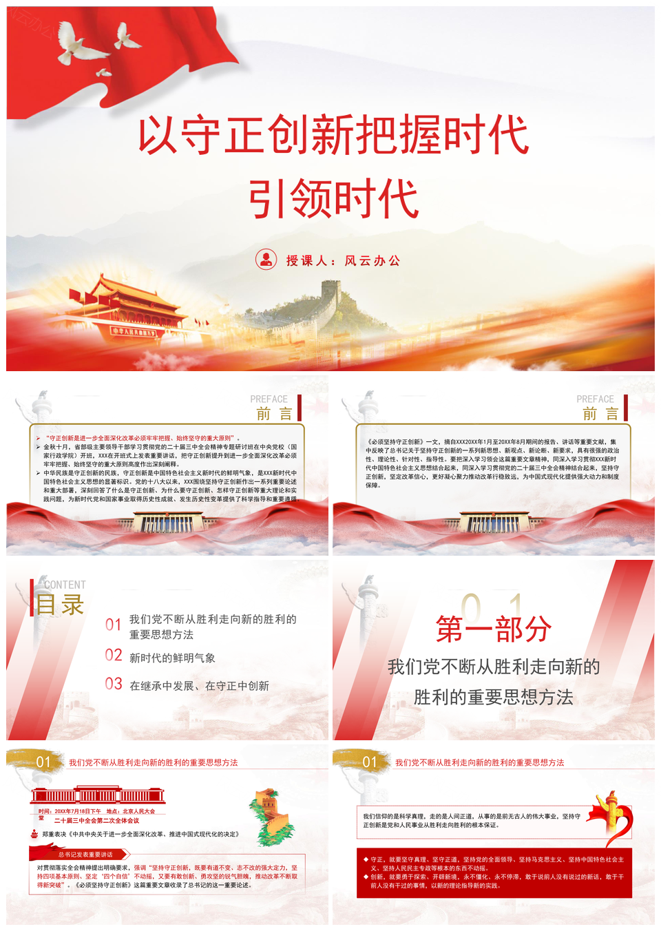 风云办公提供的守正创新把握引领时代专题党课PPT模板,下载格式为pptx,一共30页,作品中文字及图均可以修改和编辑,图片更改请在作品中右键图片并更换,文字修改请直接点击文字进行修改。