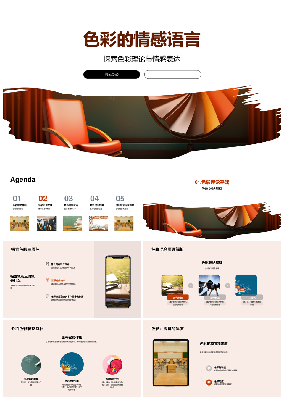 这是一张色彩理论情感心理与三原色混合明度饱和度PPT模板,包含色彩理论、情感心理、三原色、混合、明度、饱和度等主题内容,也可用作色彩理论情感心理三原色混合明度饱和度、三原色混合明度饱和度、色彩理论情感心理、理论情感心理三原色、混合明度饱和度、三原色混合明度、情感心理三原色、理论情感心理、三原色混合、色彩理论、情感心理、混合明度、明度饱和度、色彩理论情感、理论三原色等PPT场景使用。 风云办公提供的色彩理论情感心理与三原色混合明度饱和度PPT模板,下载格式为pptx,一共23页,作品中文字及图均可以修改和编辑,图片更改请在作品中右键图片并更换,文字修改请直接点击文字进行修改。