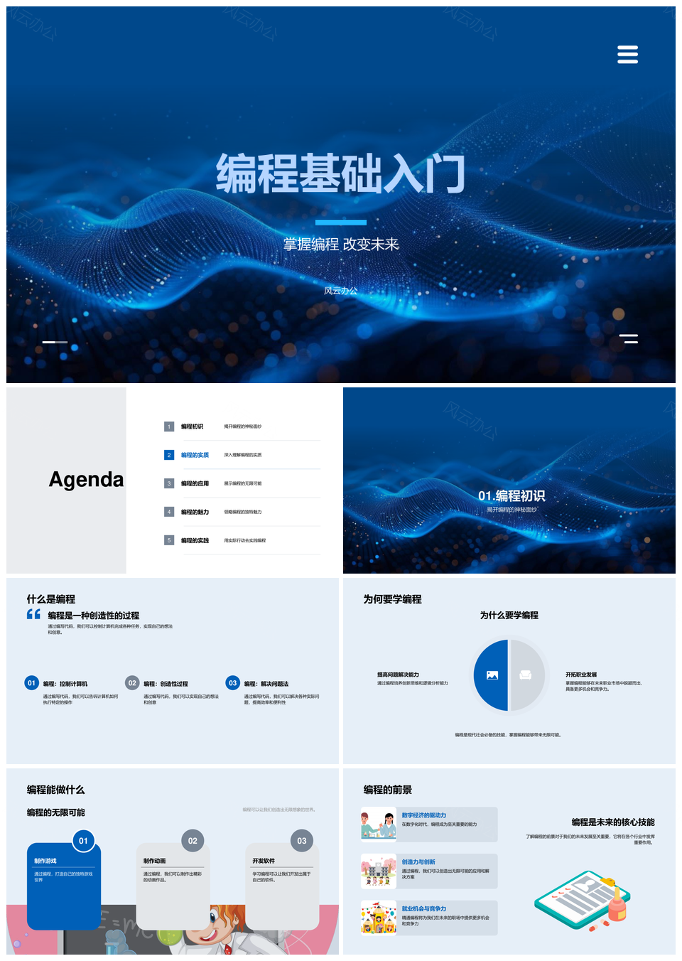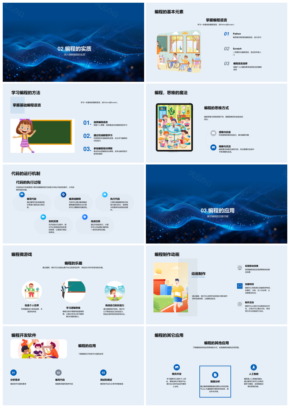 这是一张编程基础入门PythonScratch游戏动画软件开发PPT模板,包含编程基础、入门、Python、Scratch、游戏、动画、软件、开发等主题内容,也可用作编程基础入门PythonScratch、基础入门PythonScratch游戏、入门PythonScratch游戏动画、PythonScratch游戏动画软件、Scratch游戏动画软件开发、编程基础入门Python、基础入门PythonScratch、入门PythonScratch游戏、PythonScratch游戏动画、Scratch游戏动画软件、编程基础游戏动画软件、编程入门游戏动画开发、基础PythonScratch动画、入门Scratch软件开发、Python游戏动画开发等PPT场景使用。 风云办公提供的编程基础入门PythonScratch游戏动画软件开发PPT模板,下载格式为pptx,一共28页,作品中文字及图均可以修改和编辑,图片更改请在作品中右键图片并更换,文字修改请直接点击文字进行修改。