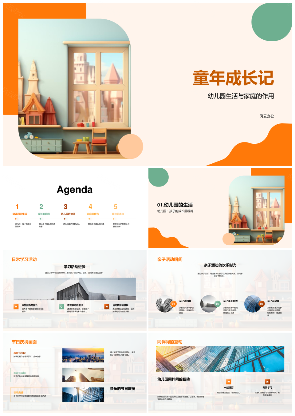 风云办公提供的幼儿园成长亲子教育节日相册PPT模板,下载格式为pptx,一共33页,作品中文字及图均可以修改和编辑,图片更改请在作品中右键图片并更换,文字修改请直接点击文字进行修改。
