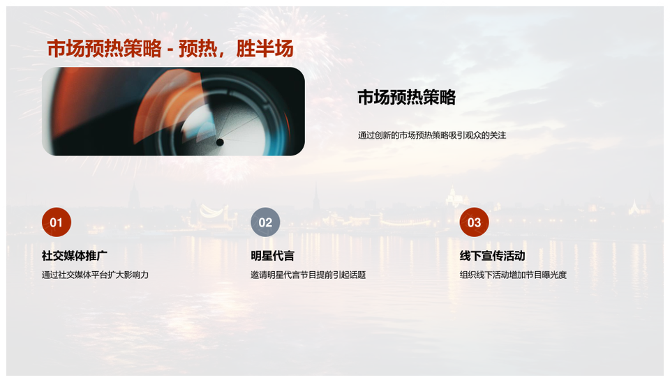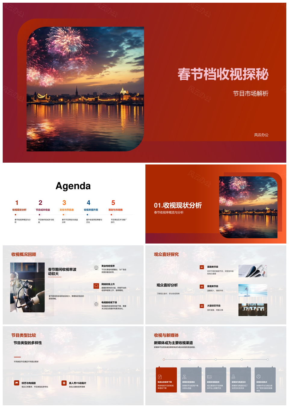 风云办公提供的春节档节目市场解析与收视提升策略PPT模板,下载格式为pptx,一共29页,作品中文字及图均可以修改和编辑,图片更改请在作品中右键图片并更换,文字修改请直接点击文字进行修改。