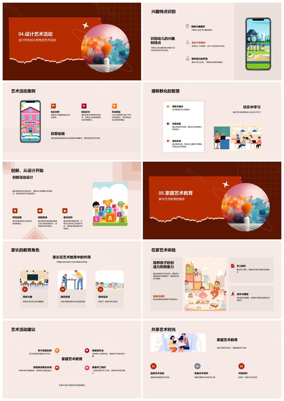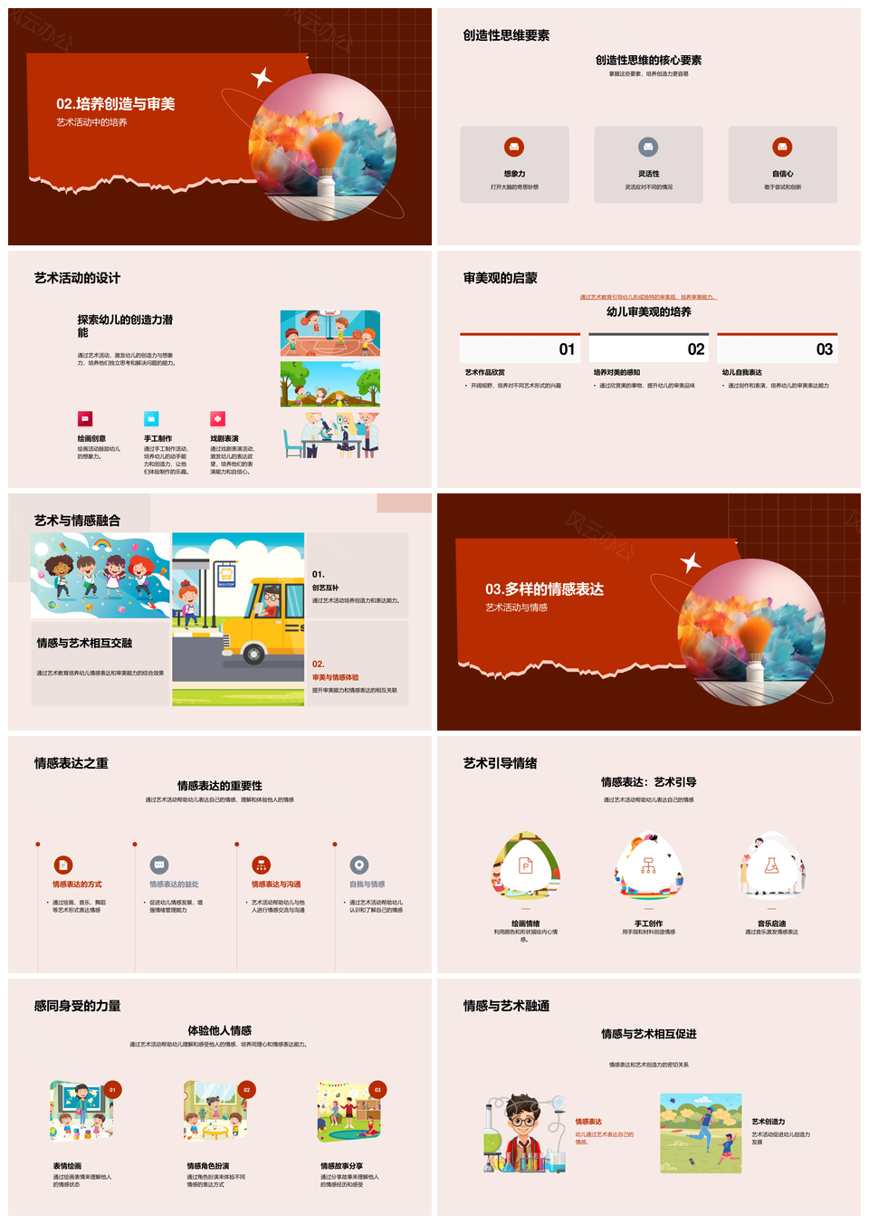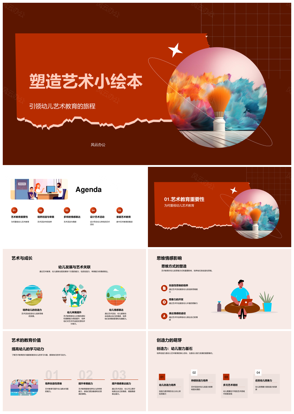 风云办公提供的幼儿艺术绘本培养创造审美多彩情感PPT模板,下载格式为pptx,一共28页,作品中文字及图均可以修改和编辑,图片更改请在作品中右键图片并更换,文字修改请直接点击文字进行修改。