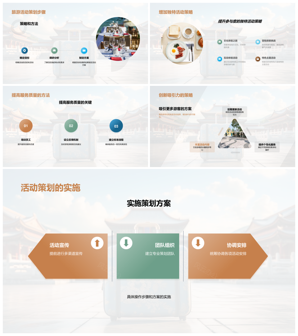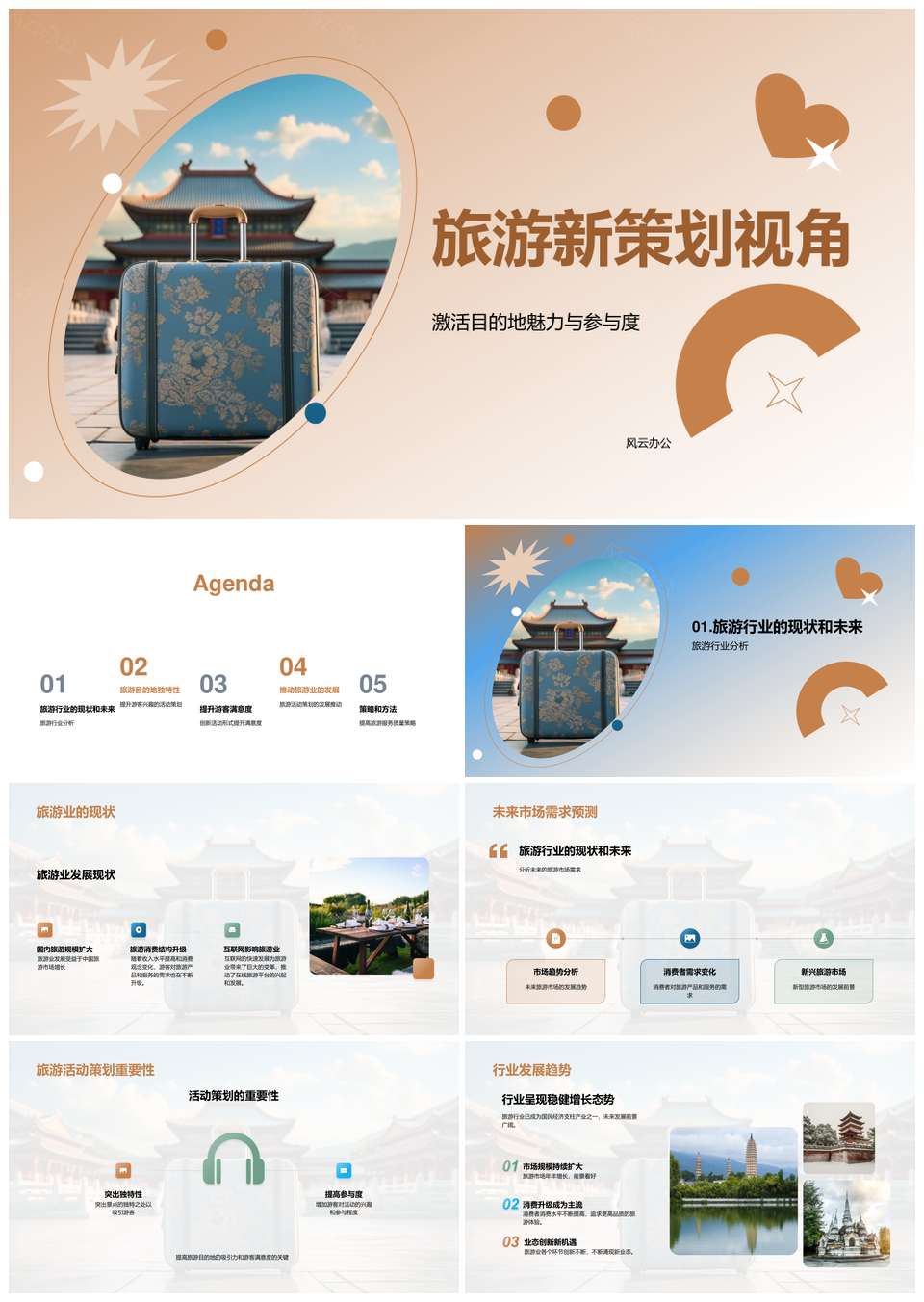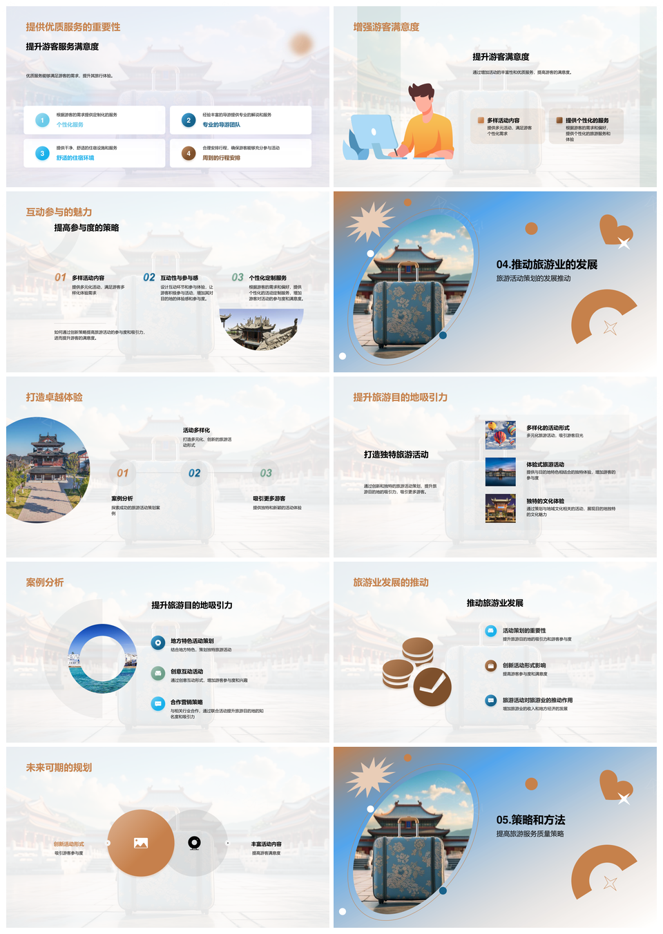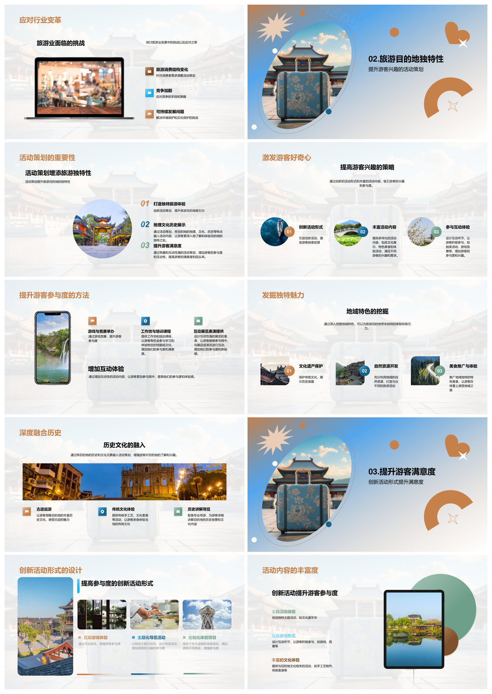 风云办公提供的创新古建旅游策划提升游客参与满意度PPT模板,下载格式为pptx,一共33页,作品中文字及图均可以修改和编辑,图片更改请在作品中右键图片并更换,文字修改请直接点击文字进行修改。