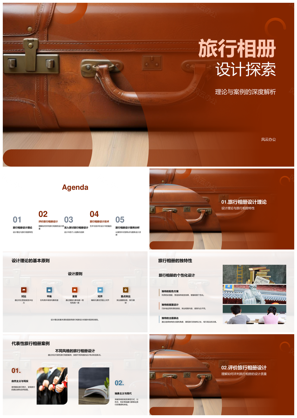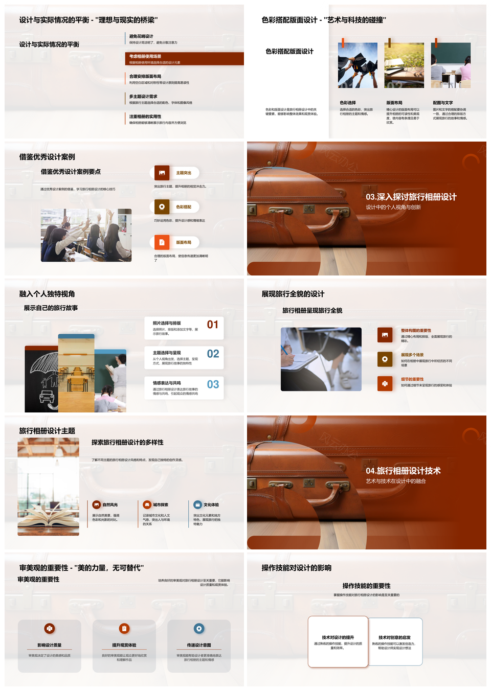 复古手提箱旅行相册设计理论色彩版面技巧PPT模板