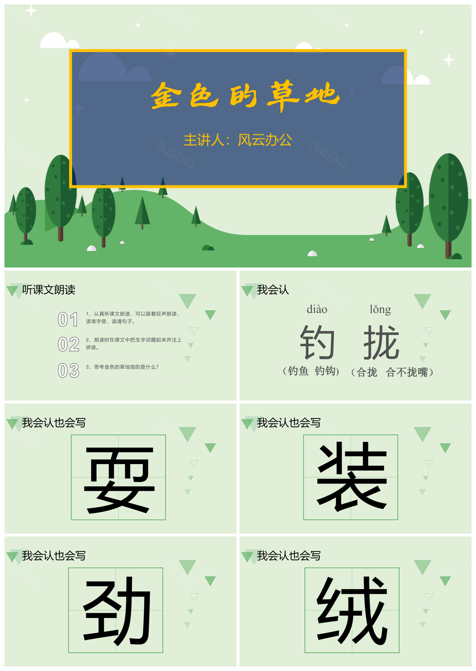风云办公提供的可编辑小学语文金色的草地教学课件PPT模板,下载格式为pptx,一共38页,作品中文字及图均可以修改和编辑,图片更改请在作品中右键图片并更换,文字修改请直接点击文字进行修改。