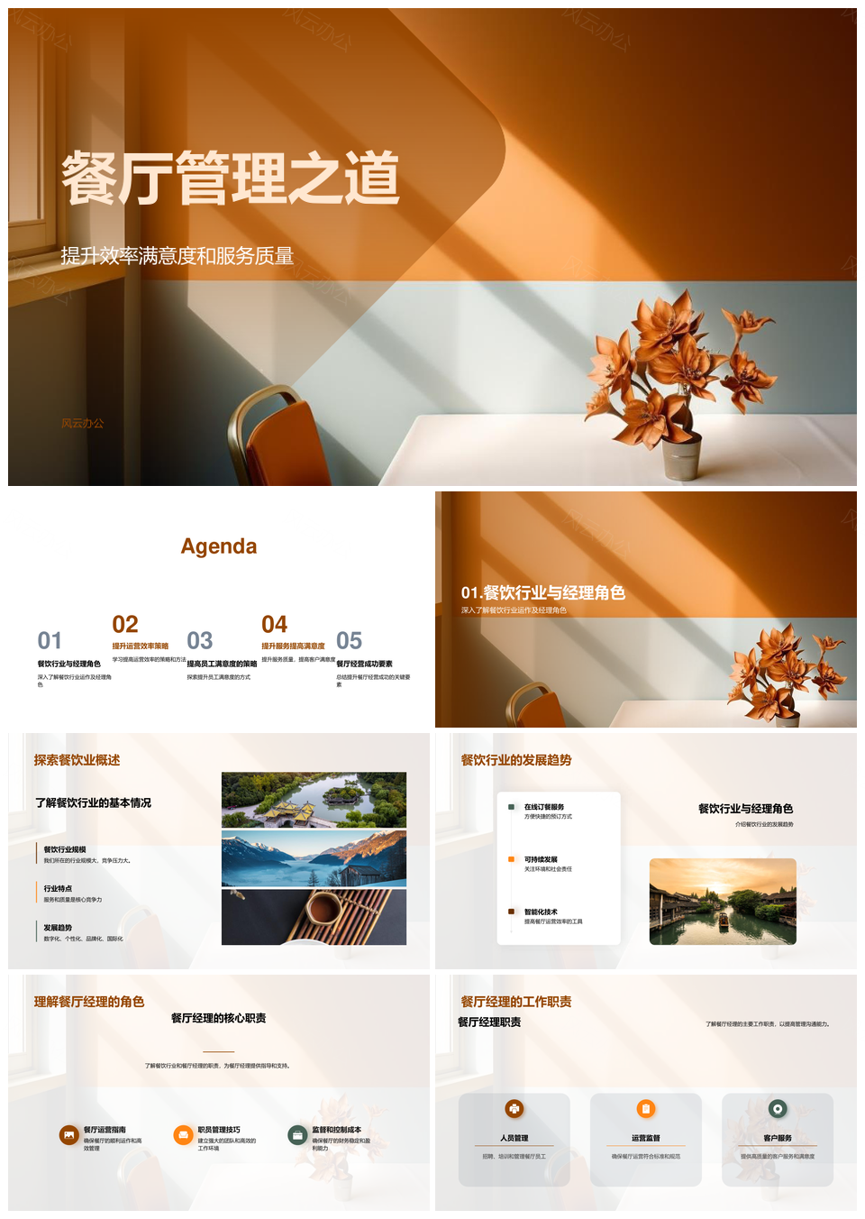 风云办公提供的餐厅高效管理优服培训与餐桌设置PPT模板,下载格式为pptx,一共33页,作品中文字及图均可以修改和编辑,图片更改请在作品中右键图片并更换,文字修改请直接点击文字进行修改。