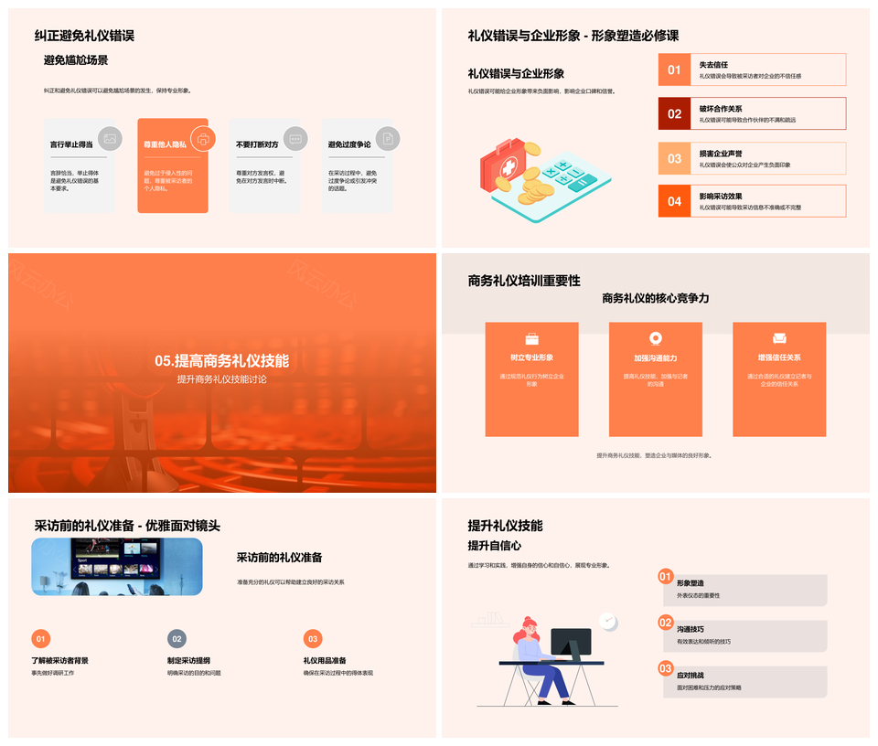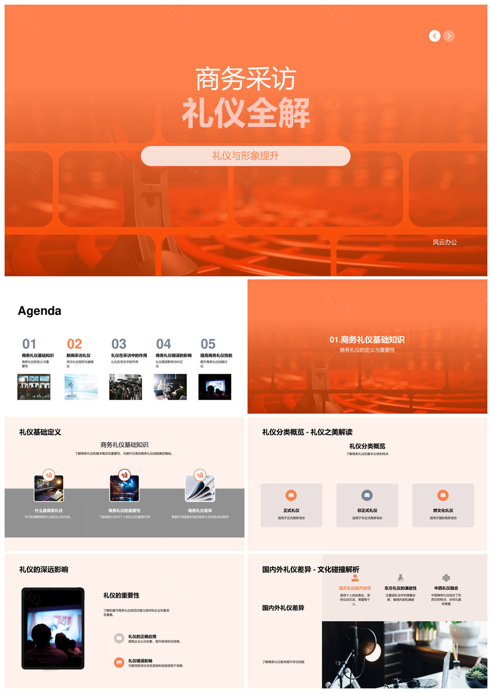 风云办公提供的商务采访礼仪企业高管媒体避错培训PPT模板,下载格式为pptx,一共24页,作品中文字及图均可以修改和编辑,图片更改请在作品中右键图片并更换,文字修改请直接点击文字进行修改。