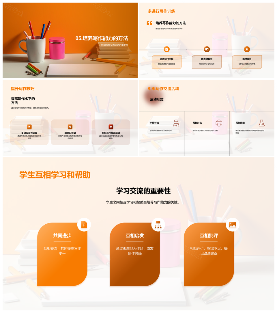 风云办公提供的学生写作兴趣培养与技巧训练解困惑PPT模板,下载格式为pptx,一共23页,作品中文字及图均可以修改和编辑,图片更改请在作品中右键图片并更换,文字修改请直接点击文字进行修改。