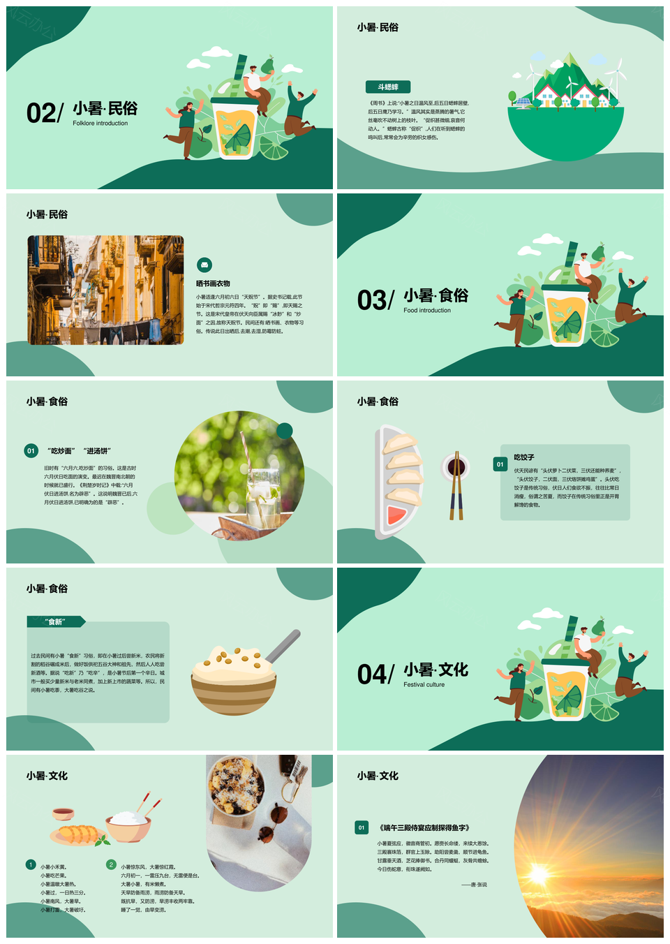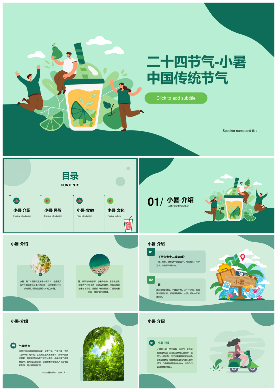 风云办公提供的绿色卡通二十四节气小暑节日插画PPT模板,下载格式为pptx,一共18页,作品中文字及图均可以修改和编辑,图片更改请在作品中右键图片并更换,文字修改请直接点击文字进行修改。