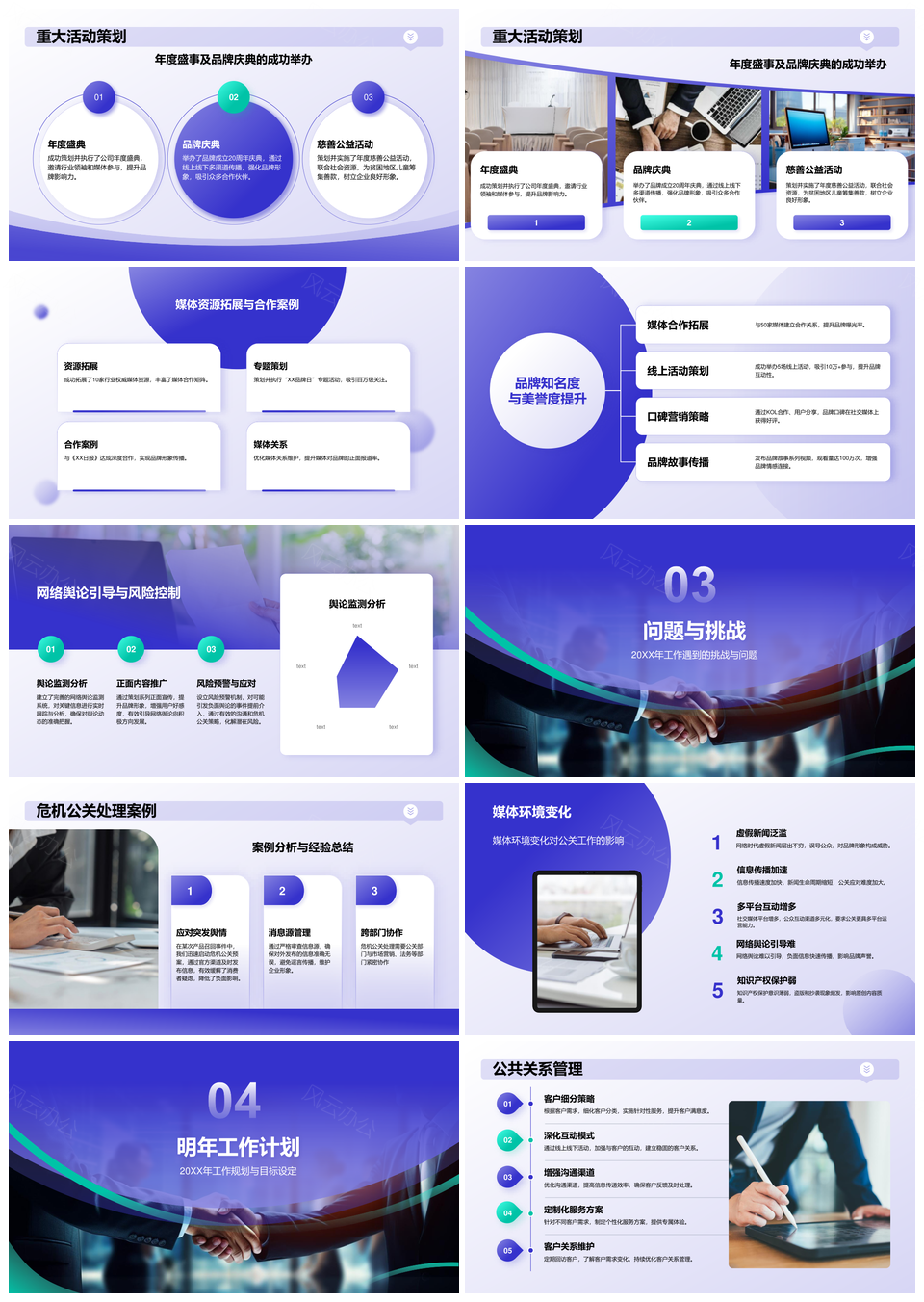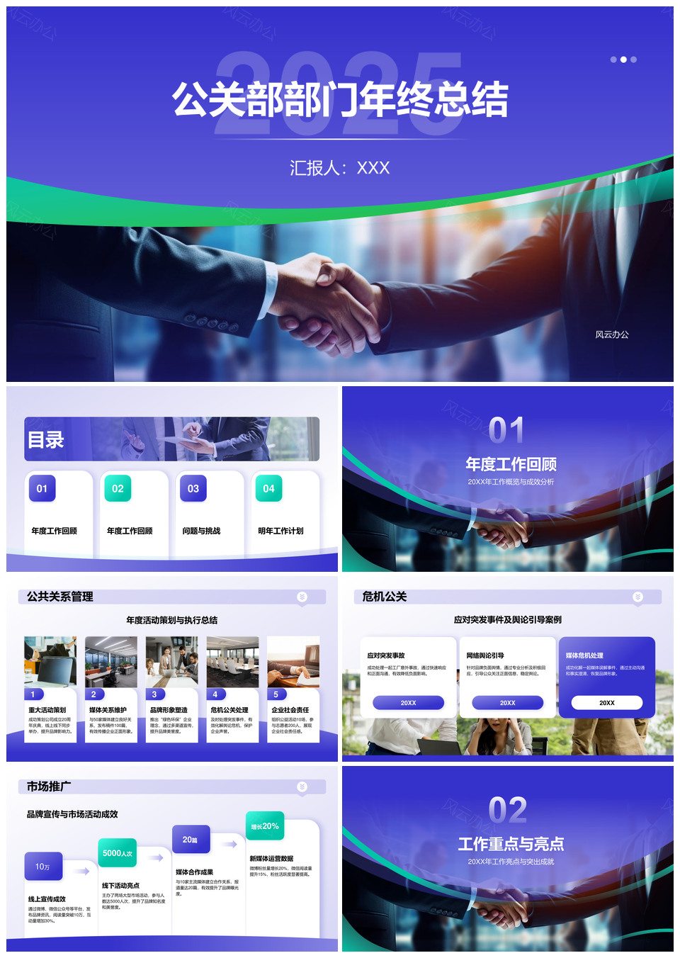 这是一张2025公关部年终总结成果品牌活动团队建设规划PPT模板,包含2025、公关部、年终总结、成果、品牌活动、团队、建设、规划等主题内容,也可用作2025公关部年终总结成果品牌活动、公关部年终总结成果品牌活动、年终总结成果品牌活动团队建设、成果品牌活动团队建设规划、品牌活动团队建设规划2025、公关部年终总结成果团队建设、年终总结品牌活动团队建设规划、2025公关部品牌活动规划、公关部团队建设规划2025、年终总结成果团队建设规划、品牌活动团队建设2025、2025公关部团队建设、公关部品牌活动规划、年终总结团队建设、品牌活动规划等PPT场景使用。 风云办公提供的2025公关部年终总结成果品牌活动团队建设规划PPT模板,下载格式为pptx,一共20页,作品中文字及图均可以修改和编辑,图片更改请在作品中右键图片并更换,文字修改请直接点击文字进行修改。