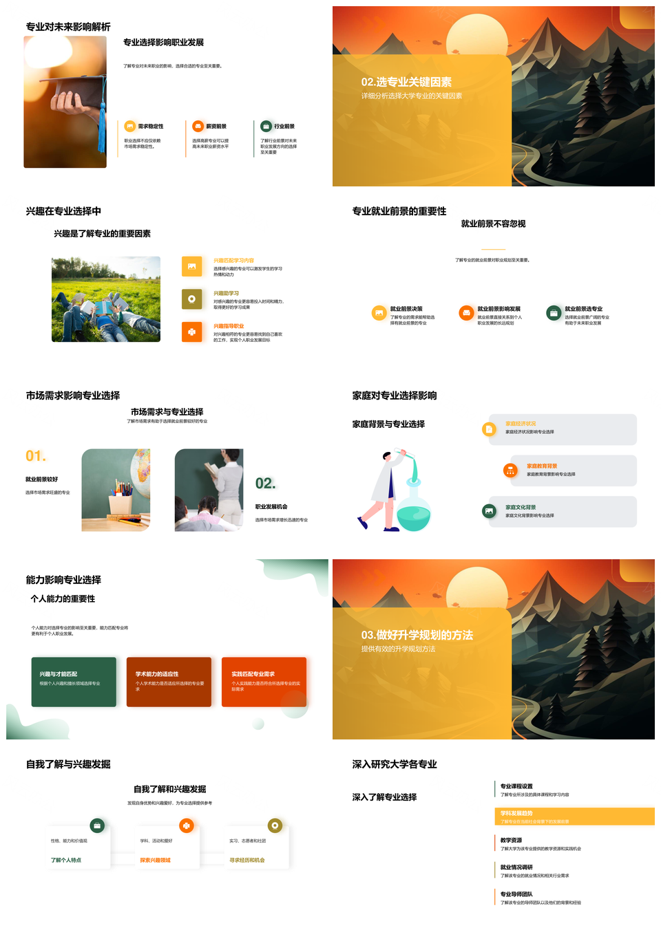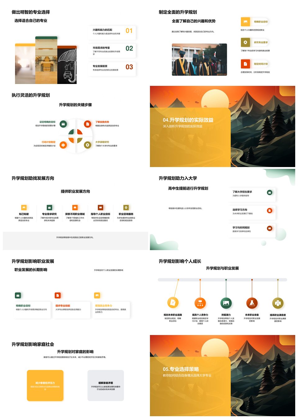 风云办公提供的高中生升学规划专业选择与就业前景PPT模板,下载格式为pptx,一共33页,作品中文字及图均可以修改和编辑,图片更改请在作品中右键图片并更换,文字修改请直接点击文字进行修改。