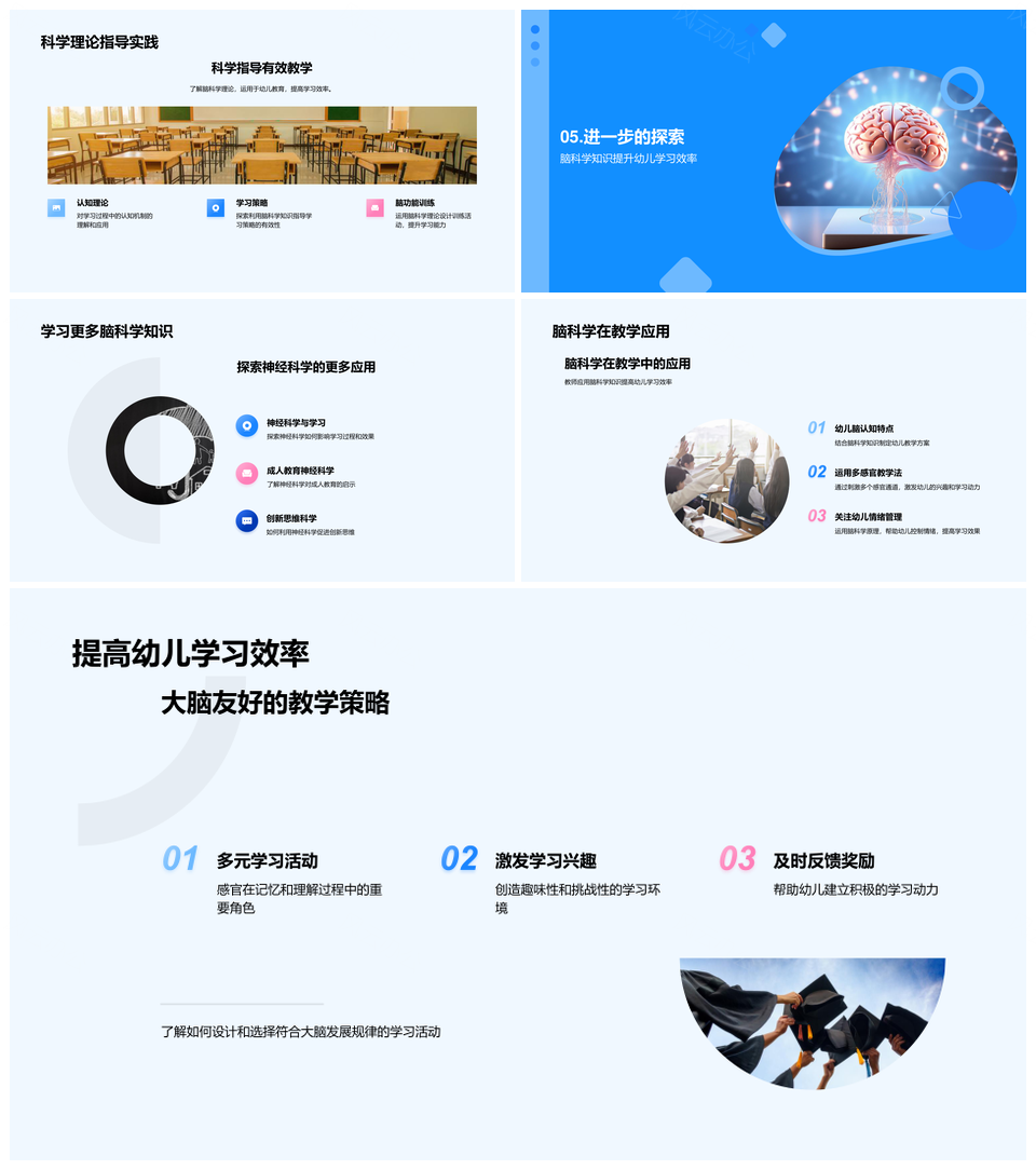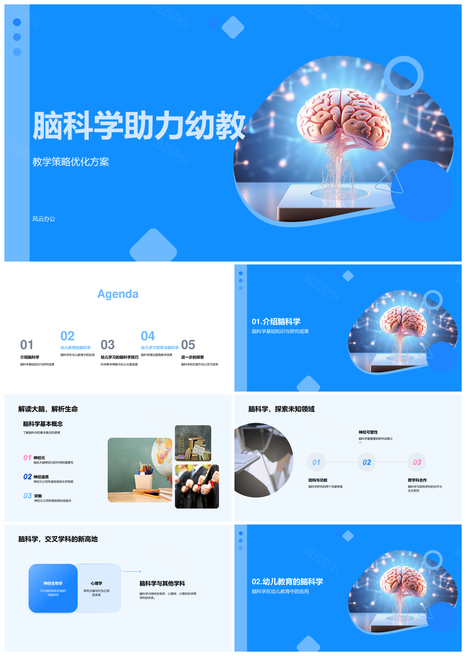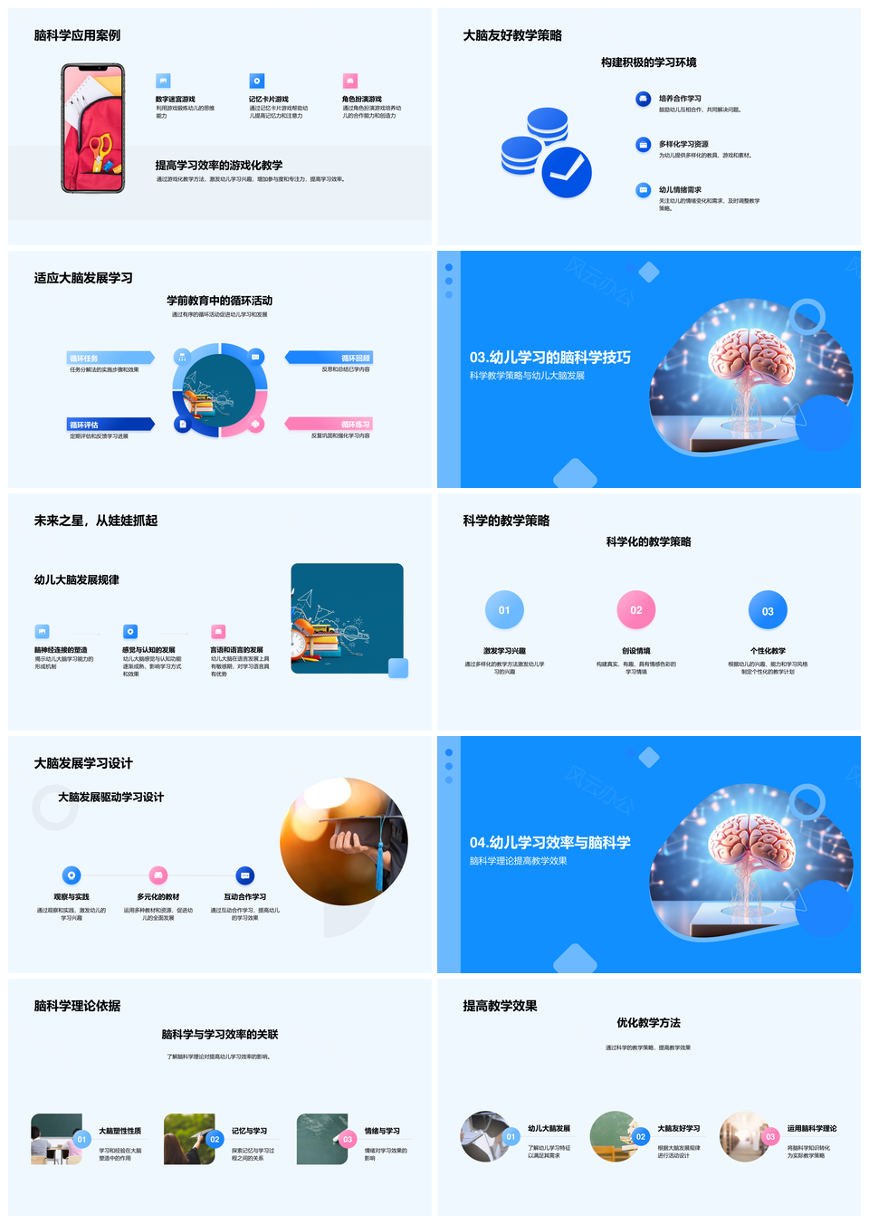 风云办公提供的脑科学优化幼教策略提升学习效率PPT模板,下载格式为pptx,一共23页,作品中文字及图均可以修改和编辑,图片更改请在作品中右键图片并更换,文字修改请直接点击文字进行修改。