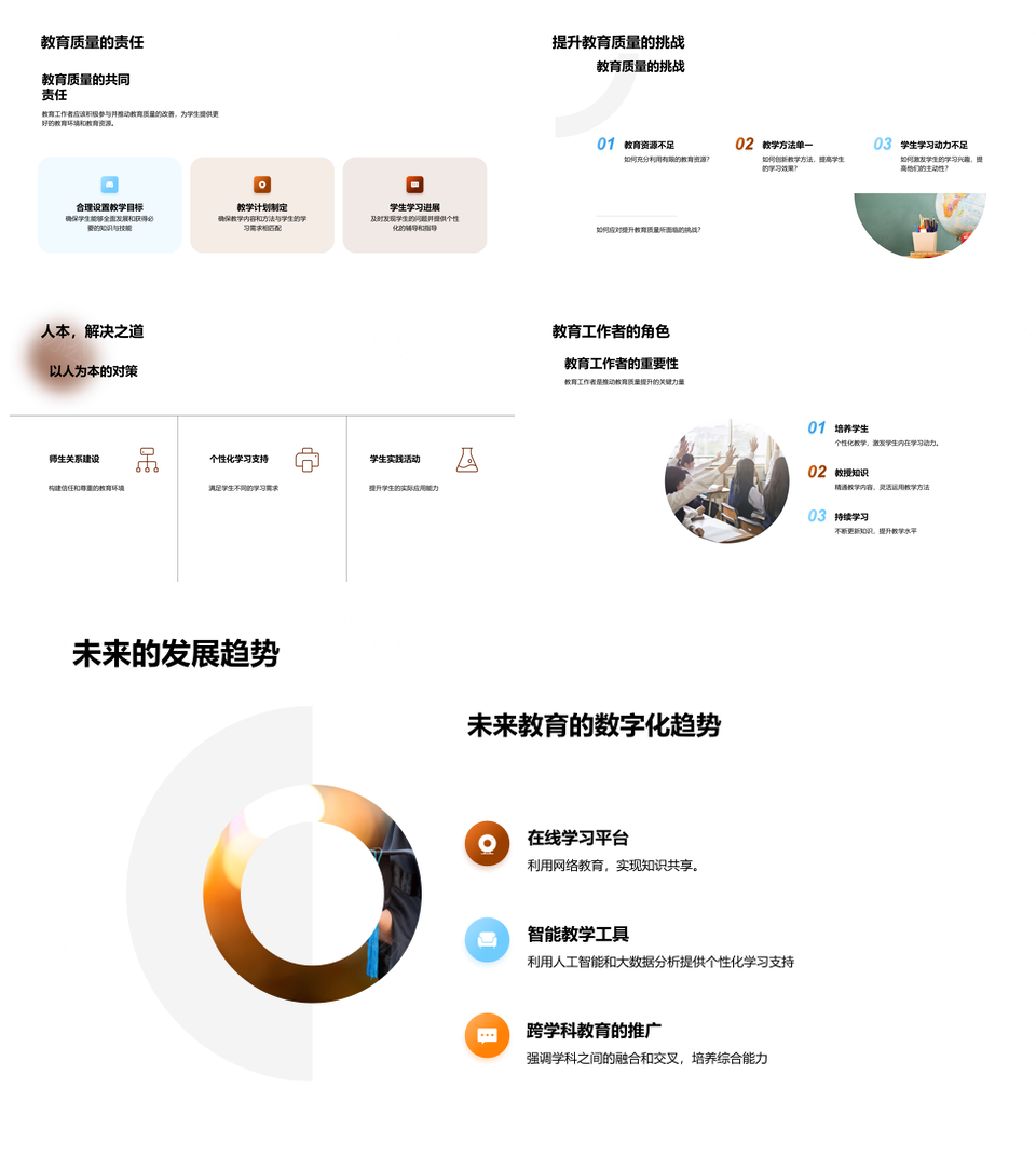 这是一张人本教育理念提升本科质量培育个性创新责任PPT模板,包含人本教育、理念、提升、本科、质量、培育、个性、创新、责任等主题内容,也可用作人本教育理念提升本科质量、教育理念提升本科质量培育、理念提升本科质量培育个性、提升本科质量培育个性创新、本科质量培育个性创新责任、人本教育理念提升、教育理念提升质量培育、提升本科培育个性创新、培育个性创新责任理念、人本教育培育个性创新、教育理念本科质量培育、提升质量培育创新责任、本科质量培育创新责任、人本教育理念培育、教育提升培育责任创新等PPT场景使用。 风云办公提供的人本教育理念提升本科质量培育个性创新责任PPT模板,下载格式为pptx,一共33页,作品中文字及图均可以修改和编辑,图片更改请在作品中右键图片并更换,文字修改请直接点击文字进行修改。