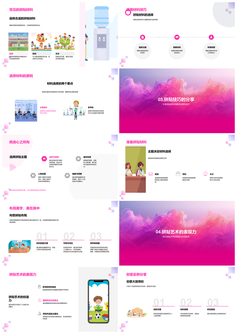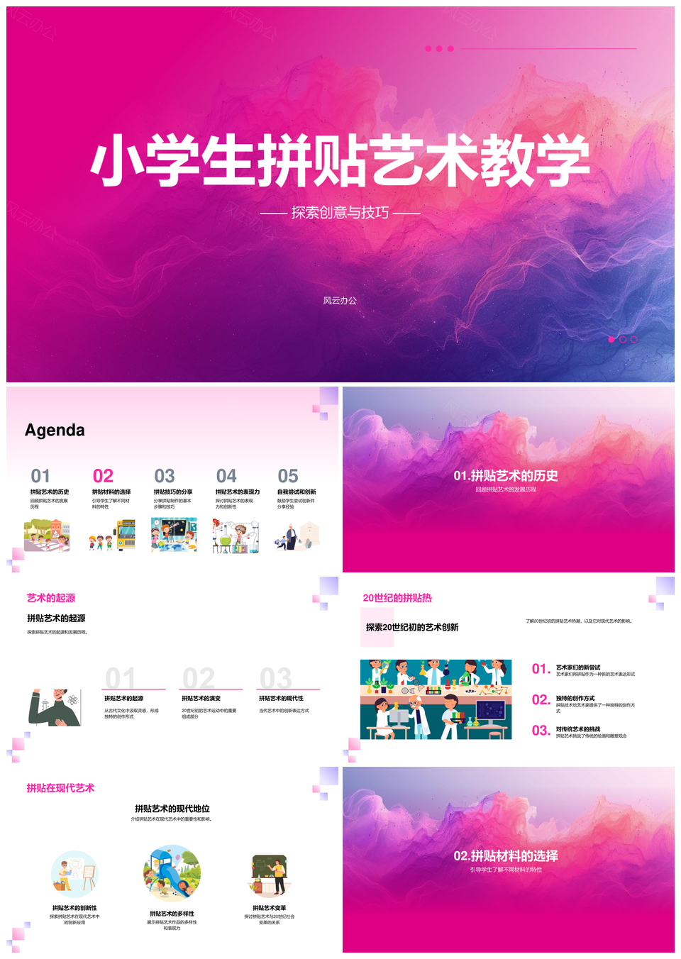风云办公提供的小学生拼贴艺术创意技巧起源教学PPT模板,下载格式为pptx,一共23页,作品中文字及图均可以修改和编辑,图片更改请在作品中右键图片并更换,文字修改请直接点击文字进行修改。