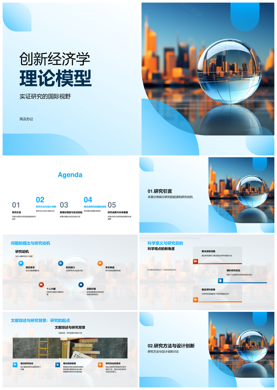 风云办公提供的创新经济学新理论模型国际实证研究PPT模板,下载格式为pptx,一共23页,作品中文字及图均可以修改和编辑,图片更改请在作品中右键图片并更换,文字修改请直接点击文字进行修改。