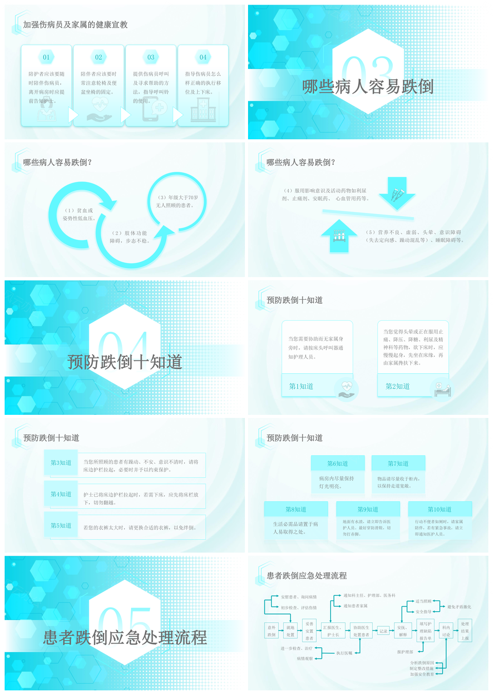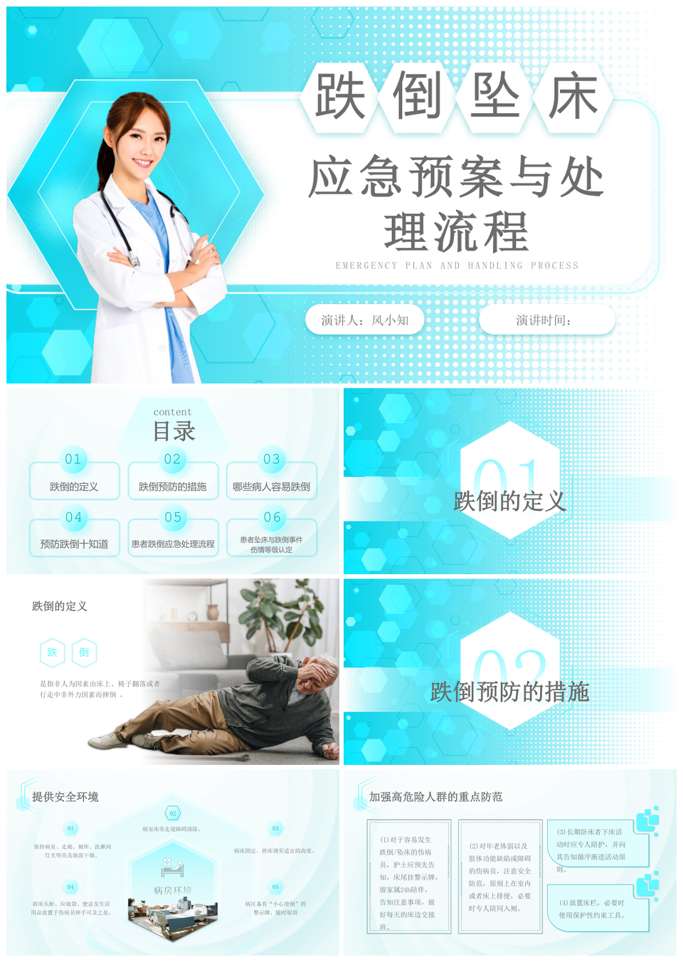 浅蓝色简约跌倒坠床应急培训演练医护预案PPT模板推荐